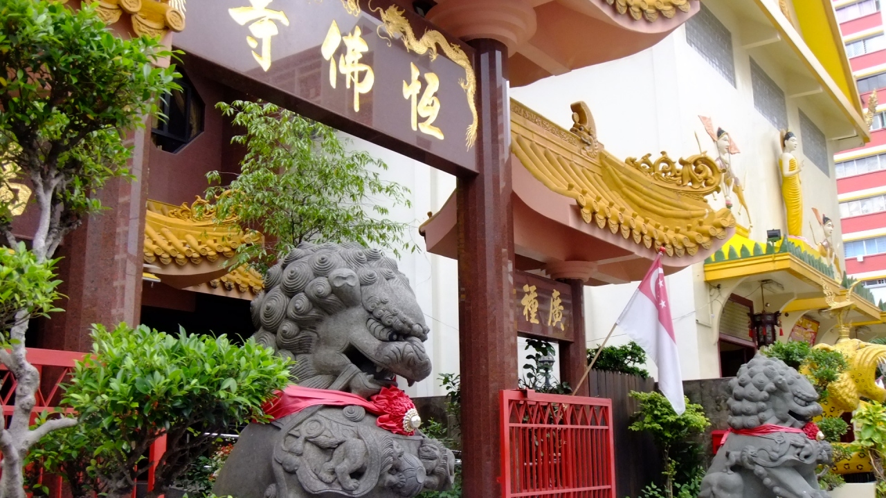 リトルインディアの奥のほうにある寺院です。中国風の建物で、道教のお寺ということです。屋根の装飾も凝っていて、中も赤を基調として鮮やかで豪華で驚きました。現地の人たちがお祈りをしていらしたので、静かに見学をさせていただきました。
