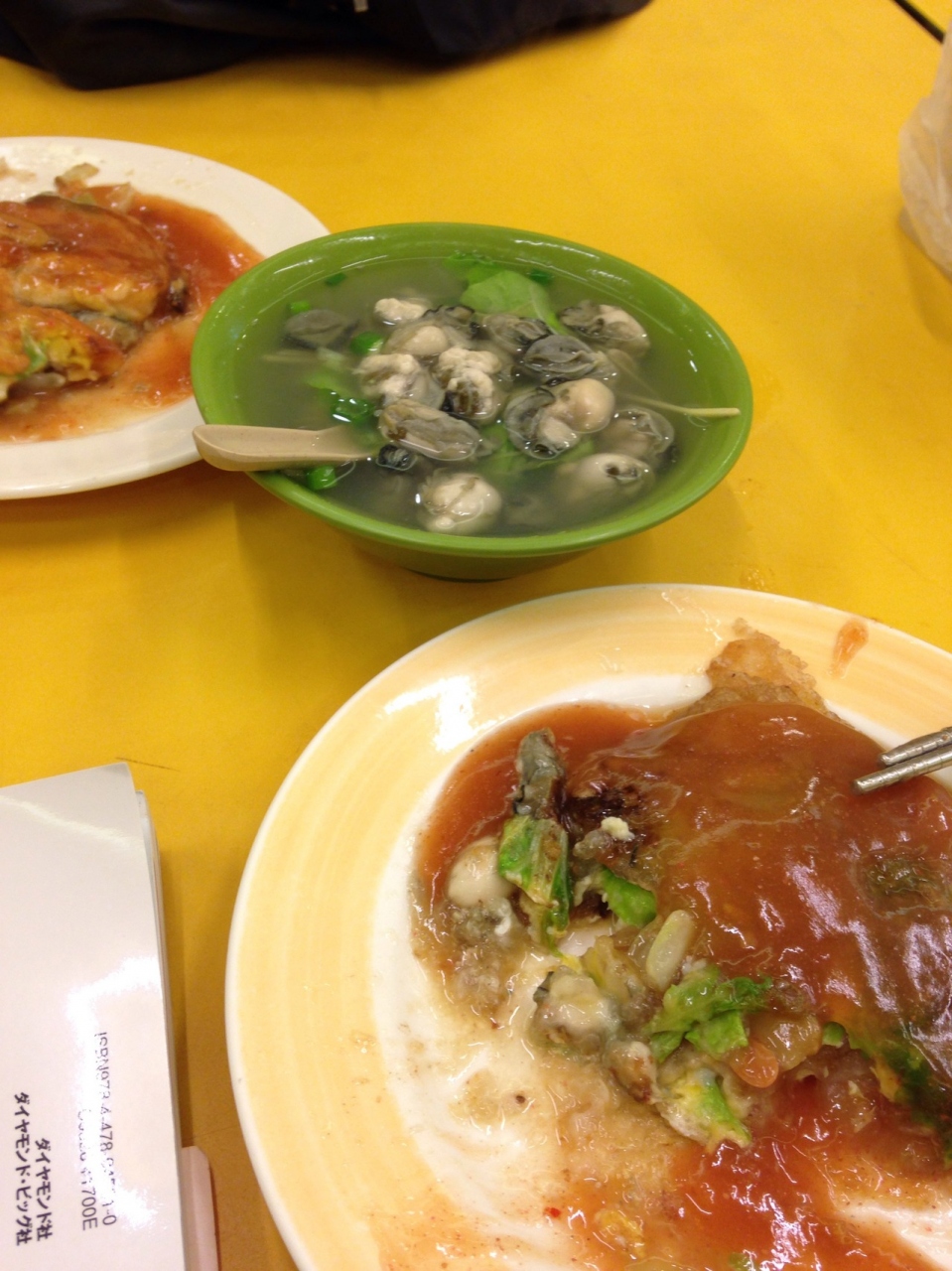 メニューは牛肉や鶏肉をのせたご飯や麺類、揚げ物、蒸し物、スイーツ、果物など、東南アジアの定番ですが、珍しかったのが、小振りの牡蠣のオムレツとスープ。きっと近くで沢山採れるのでしょう。牡蠣オムレツは、タイのオースアンに似ていて感激。大好きです。