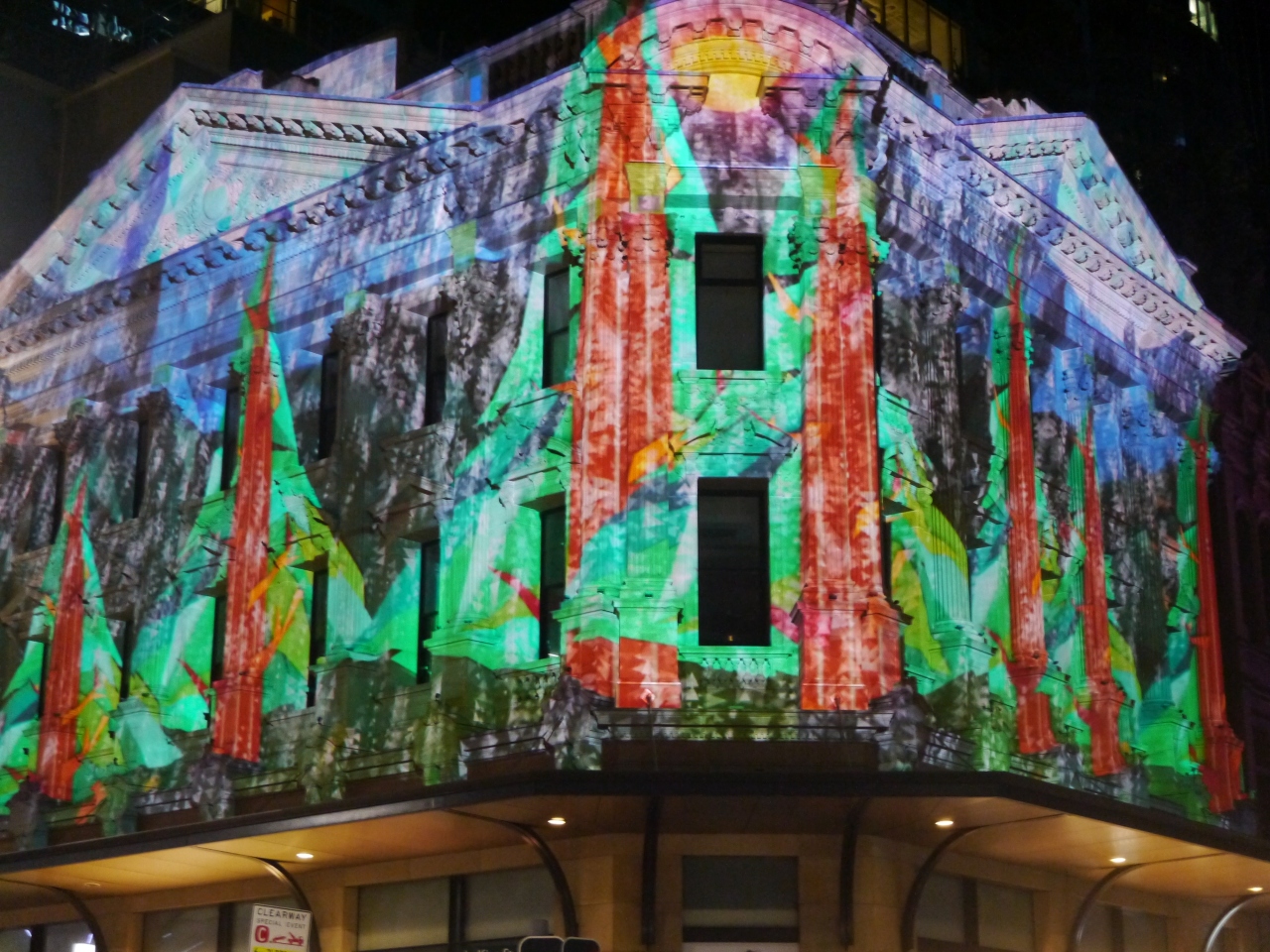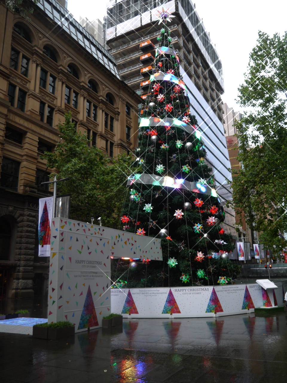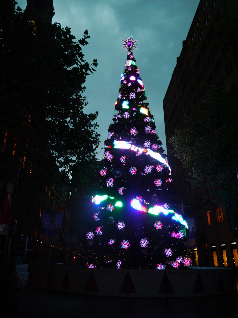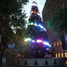大きなクリスマスツリーが飾られていました。スマホからメッセージが送れ、電飾が光るそうですが、方法がわからず、断念しました。途中から雨が振り出し、イベントで聖歌を歌う予定だった女の子たちが、雨宿り場所で練習をしただけで帰ってしまいました。近所では、プロジェクションマッピングをしている家屋(なんの施設かよくわかりませんでした)もありました。