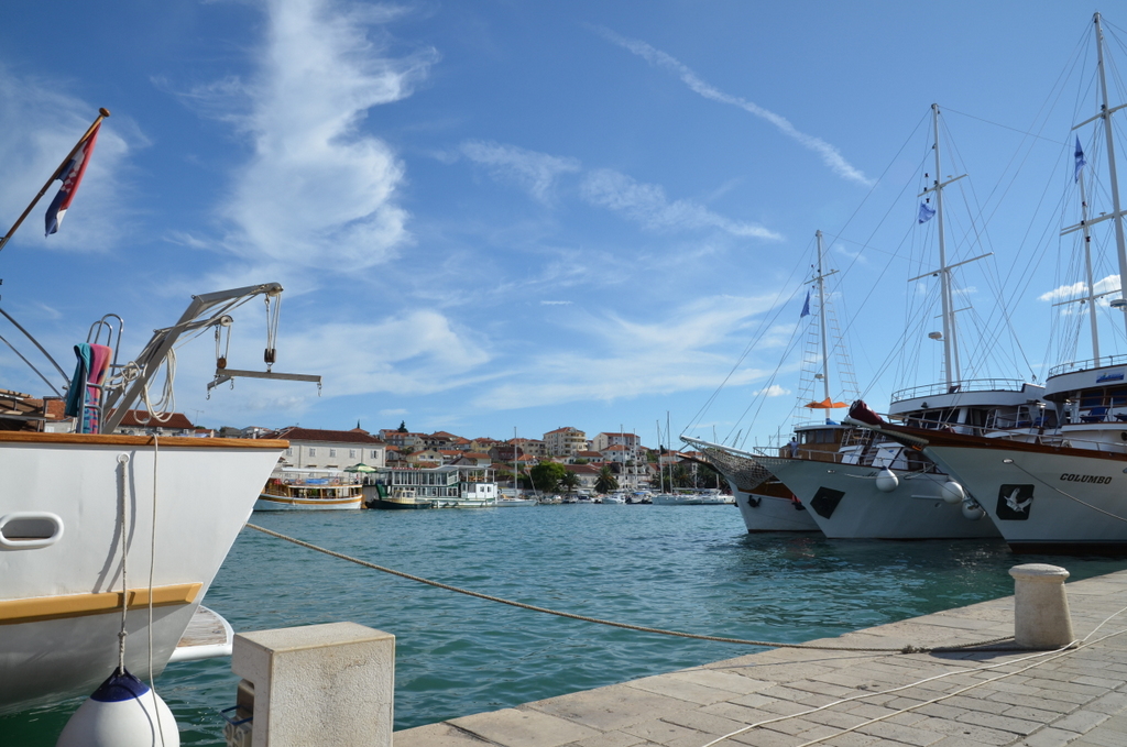狭い路地が入り組んだ小さな町を抜けると、クルーザーが並ぶ港が広がっています。