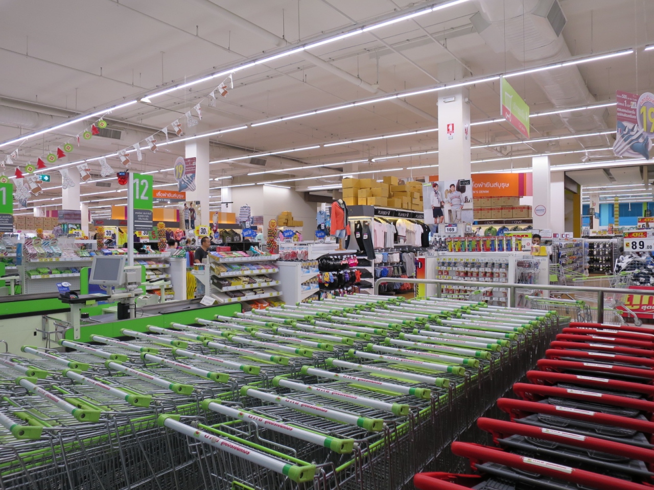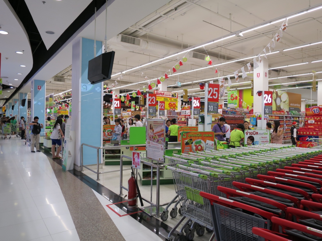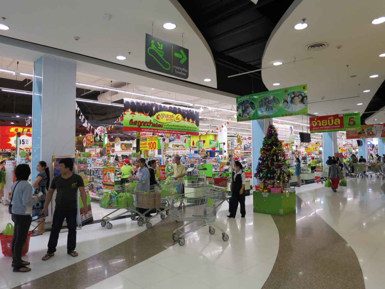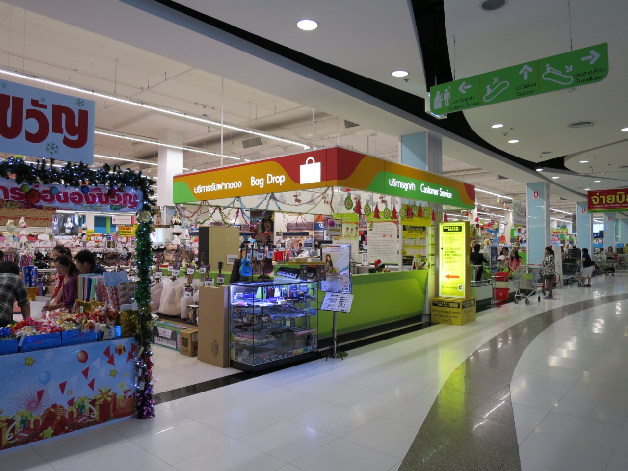 バンコクを旅行する人には、ラーチャプラソン交差点(「インターコンチネンタル・バンコク」・「グランドハイアット・エラワン・バンコク」・「セントラルワールドプラザ」に囲まれた交差点です)を起点に動く人は少なくないと思います。それゆえ義理土産も、このラーチャプラソン交差点界隈で購入できれば一石二鳥ではないでしょうか。ただ、観光客であふれる地域ですから、この辺りの物価はバンコクでも高めなのが玉に傷です。そこで「BIG-C」の存在価値が大きくクローズアップされてきます。2階の食料品売り場には、義理土産向きお菓子も色々と売られていて楽しいと思います。また3階は衣料品・雑貨類が中心で、クズ服…失礼…お土産向きの安価なTシャツ類なども多いですよ。そして4階のレストラン街のフードコートでは、外国人観光客が利用しやすいよう、メニューは英語併記の写真付ですから、タイ初心者にも安心だと思います。