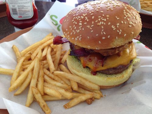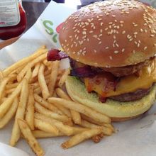 大きなハンバーガーにポテトが添えてある いかにもアメリカンな見た目。