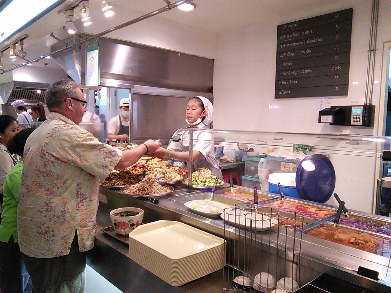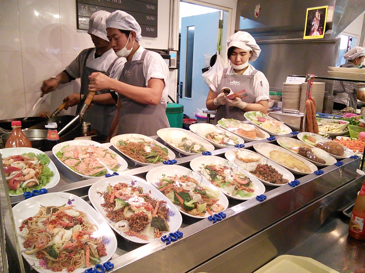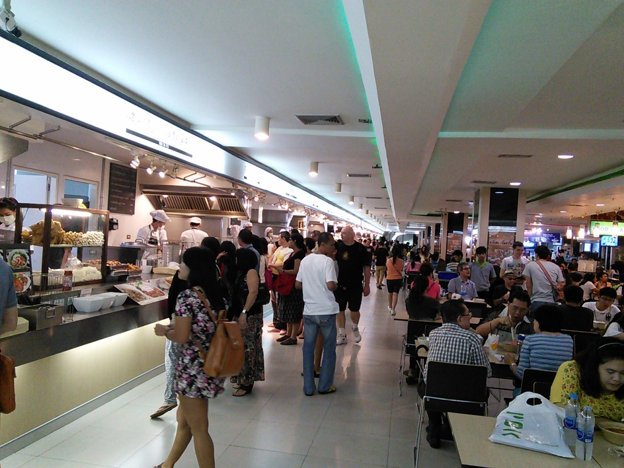 MBKのフードコートは2つあります。5Fはちょっぴり高級め、6Fは庶民派です。行くなら絶対に6Fの方が楽しいと思います。食べ物であふれています。しかし日曜日のお昼などに行くと人もあふれているので覚悟して行って下さい。メニューは40~50Bくらいからありますがタイ飯の量は少ないので2品くらいなら食べられます。サンプルや写真がある店がほとんどなので簡単に注文できます。クーポンはプリペイドカード式。専用カウンターでお金を払うとその分だけチャージされたカードをもらえます。お店でカードを出すとその金額だけ引かれます。次回来たときに残額を使ってもいいし、もう必要なければカードを返すと残金が返ってきます。