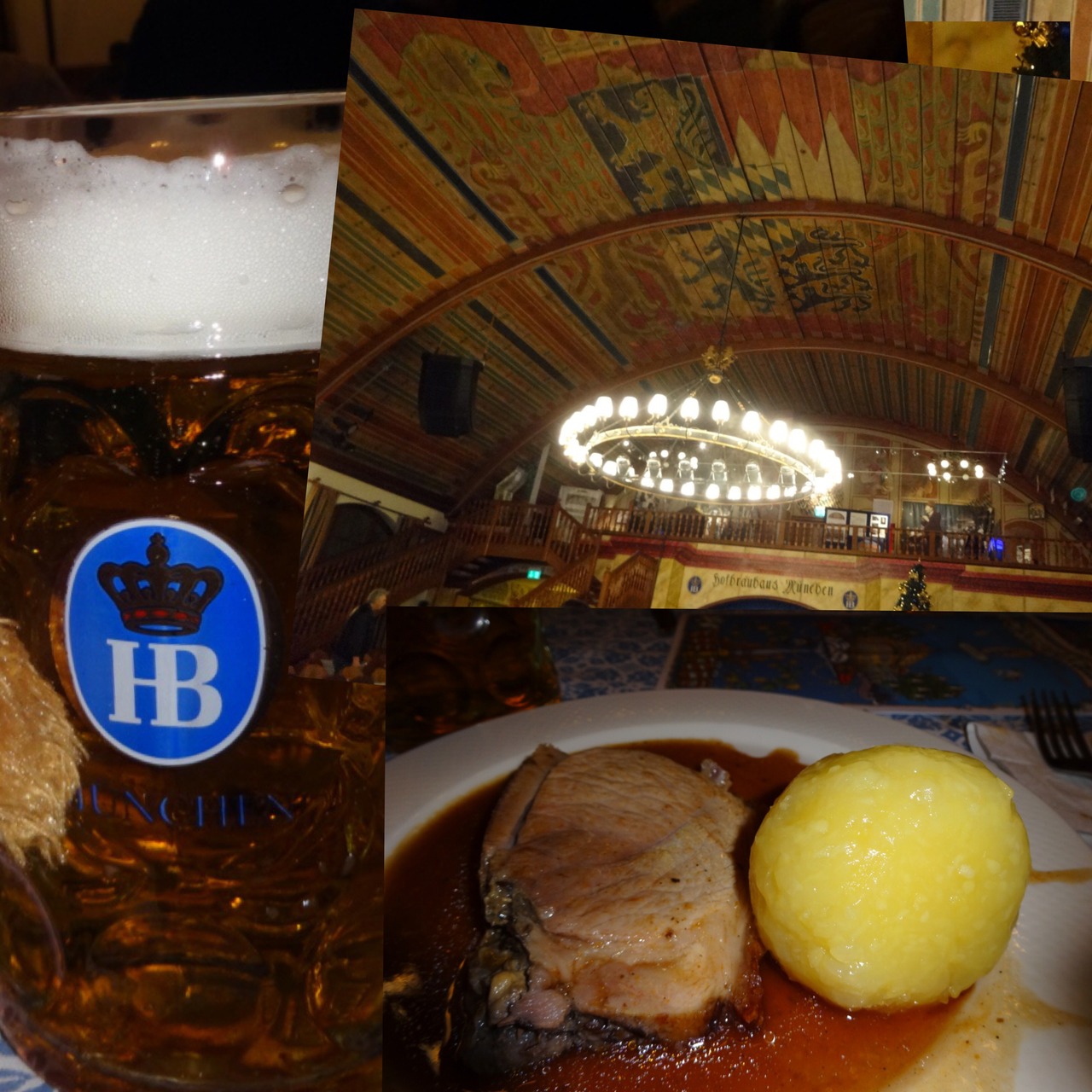 ツアーの夕食で利用。団体客フロアは3階。天井はビア樽を模していた。舞台では生演奏などが行われ、楽しい雰囲気。注文から、ビールが運ばれてくるまで少し時間がかかった。1リットルのビアジョッキは重たいが飲みごたえがあり、飲み干した時は達成感。食事は、シュバイネブラーテン(豚肉のロースト)。厚切り肉にソースがかかっており、付け合わせはジャガイモ餅。ビールによく合う味付けで美味しかった。ビールでお腹がいっぱいになるので、ツアー客の殆どが食べきれず、残していた。ビアホールの雰囲気をちょっと知りたい人にとっては良い所かと。