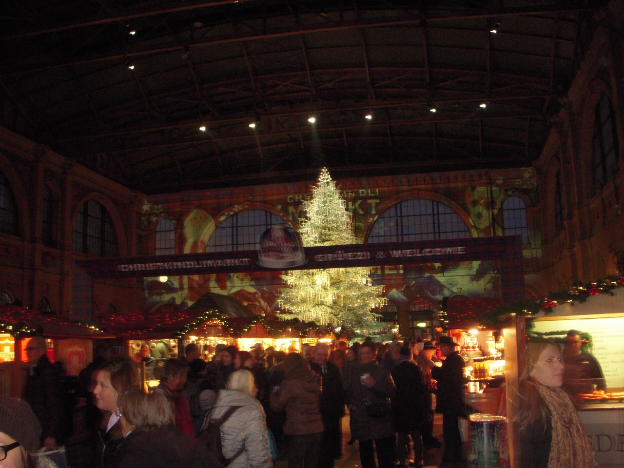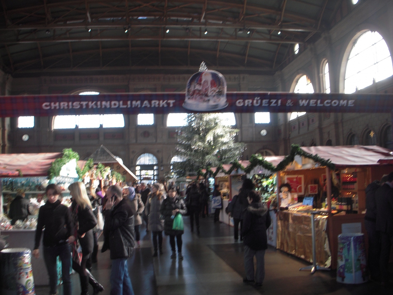 中央駅内では、スイス最大級の屋内マーケットが開催されており、スワロフスキーのクリスタル約5000個で飾られた高さ15mの巨大ツリーが綺麗に飾られていました。