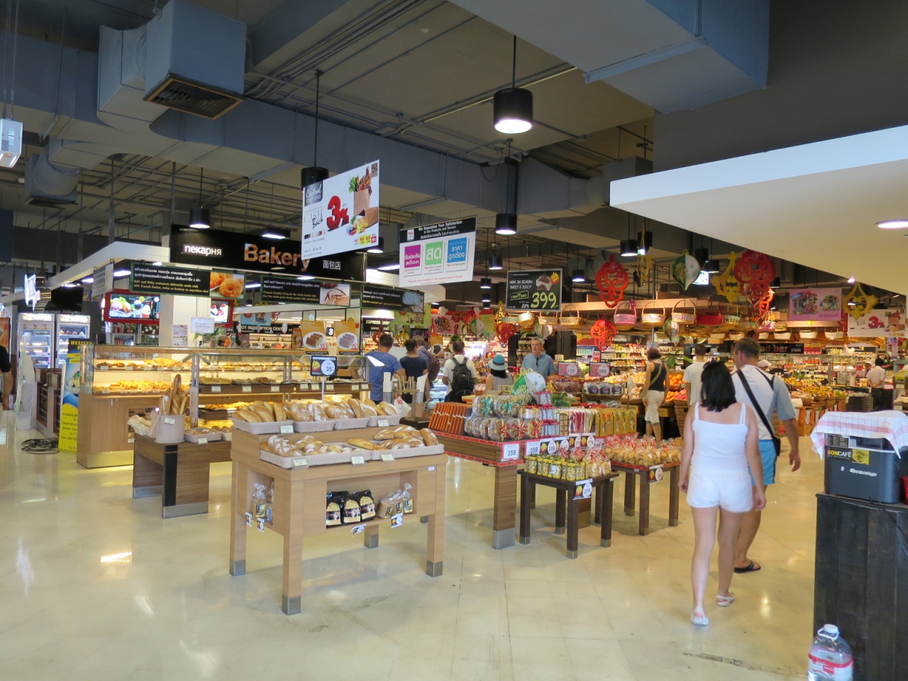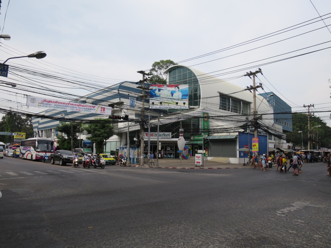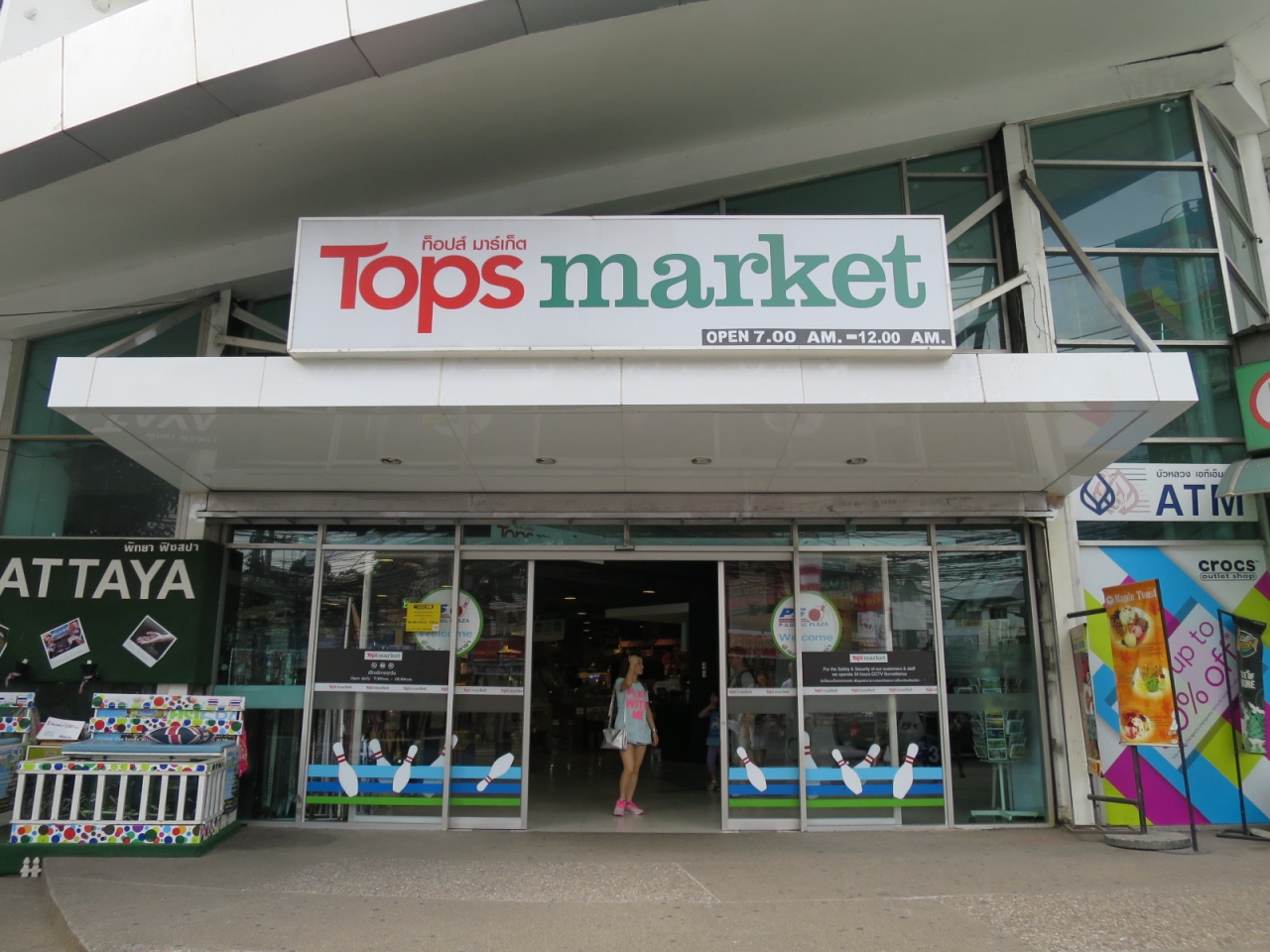 セントラルロードとセカンドロードの交差点にある、セントラル系食料品中心のスーパーマーケット「Tops」です。バンコクなどで利用する頻度の高いスーパーマーケットですが、それはセントラル系デパートの「ロビンソン」などに併設されているからで、このように「Tops」がメインとなっている店舗は、ここ以外では見たことがありません。さて評価ですが、店舗内の照明が暗めなのと、華やかなデパートに併設されていない分、やはり華はなく、あくまで普段使いのスーパーマーケット以上のものはありません。ただ日本人旅行者に特別な点は、2階部分にHISの支店が入居していることです。