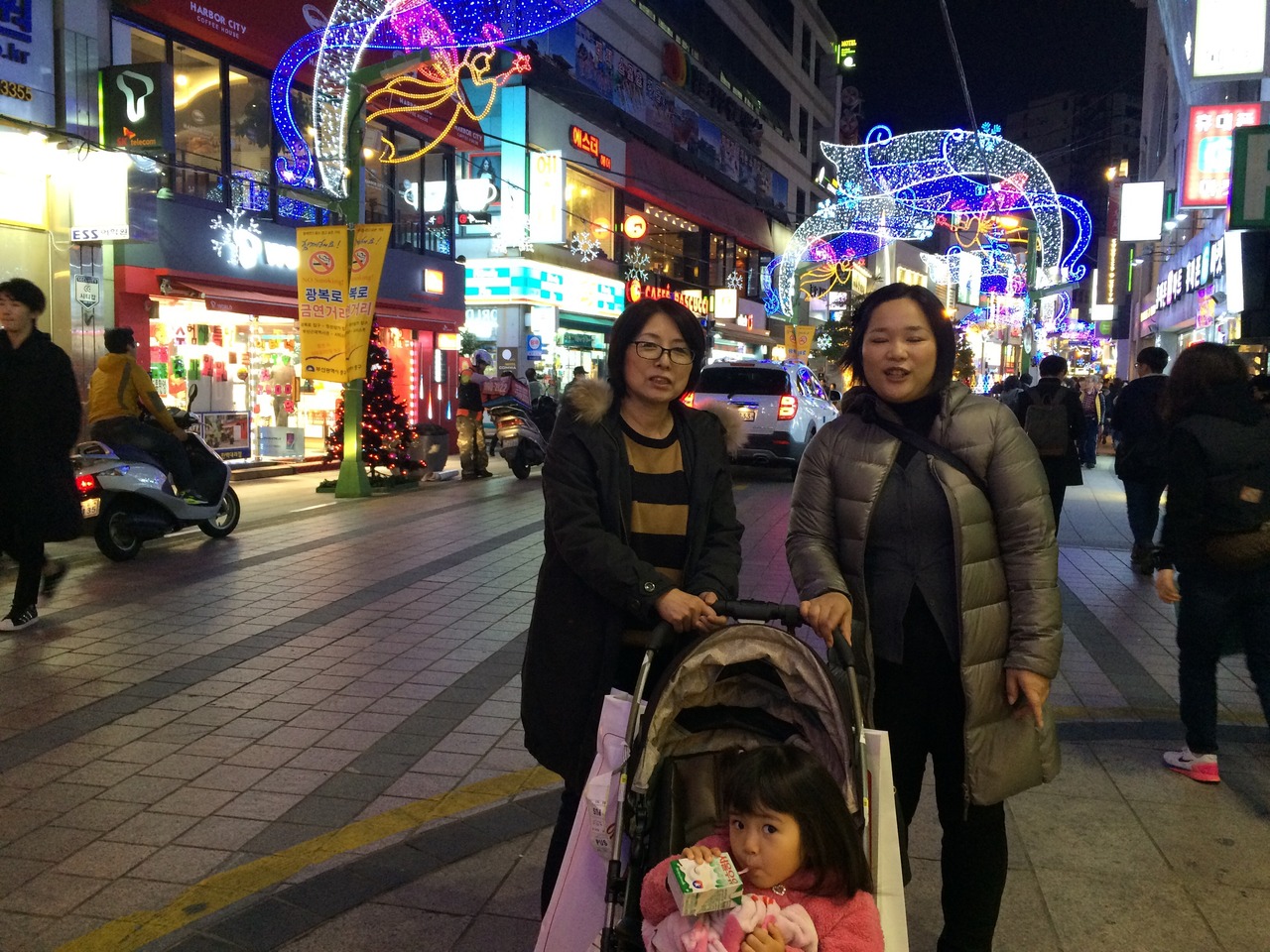 南浦洞のホテルに宿泊したため周辺を散策。11月でしたがクリスマスイルミネーションがとてもきれいで、大人も子供も大喜び。11月にも関わらずセールをしているお店が多く日本で人気のコスメストアでも50%オフになっていてお得でした。飲食店も数えきれない位あります。