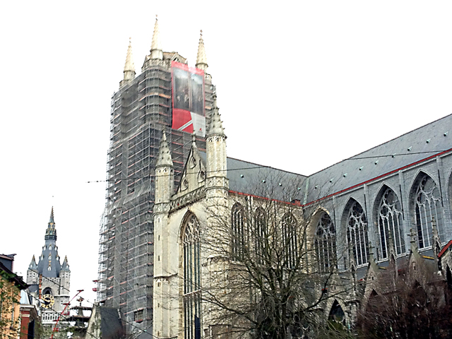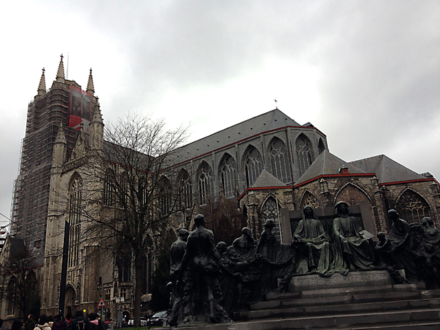 12世紀より400年かけて作られた大聖堂で、ロマネスク様式とゴシック様式が混在しているのが特徴です。神聖ローマ帝国皇帝カール5世が洗礼を受けた格式ある大聖堂としても知られています。外観は一見地味ですが、この大聖堂を一躍有名にしているのが内部にある15世紀フランドル絵画の最高傑作と言われる「神秘の子羊」の祭壇画です。ファン・アイク兄弟合作によって描かれたもので、ゲントの貴族によって大聖堂に寄贈されました。教会は無料で入れますが絵を見るのは有料です。絵は防弾ガラスに守られ、写真撮影もNGです。観音開きの扉がついていて裏面にも絵が描かれています。本物の他に、神秘の子羊がもともとあった場所にレプリカも展示されていて、本物は、現在、入って左手の小部屋にあります。レプリカがある部屋にはコイン式のスポットライトがあるので、そこにコインを投入すると3分程度明かりが当たり、しっかりと観察ですます。レプリカは写真撮影もOKです。