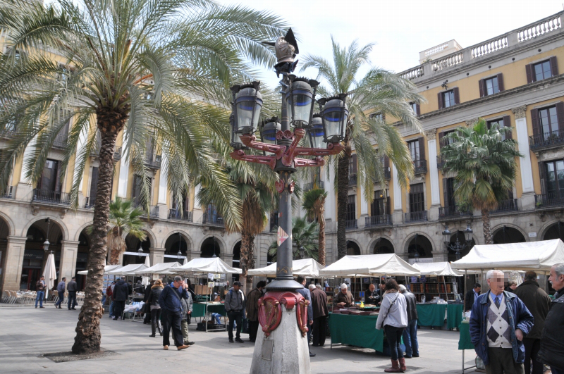 ランブラス通りから少し入った場所にある広場。天高く茂るシュロの木と、ガウディがデザインしたガス灯があることで知られています。灯った姿を観たいですが、レイアール広場は治安があまりよくないそうなので、夜に行っていいものかどうか。