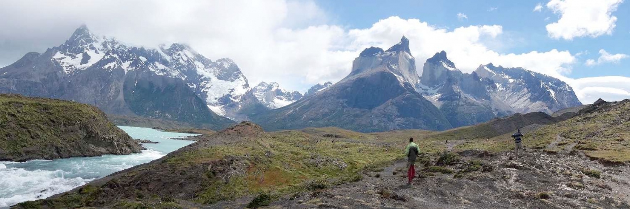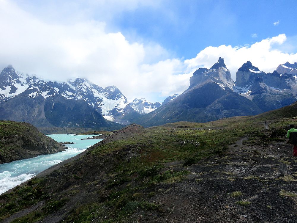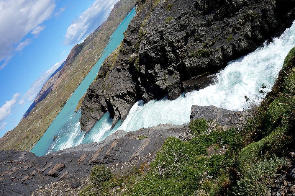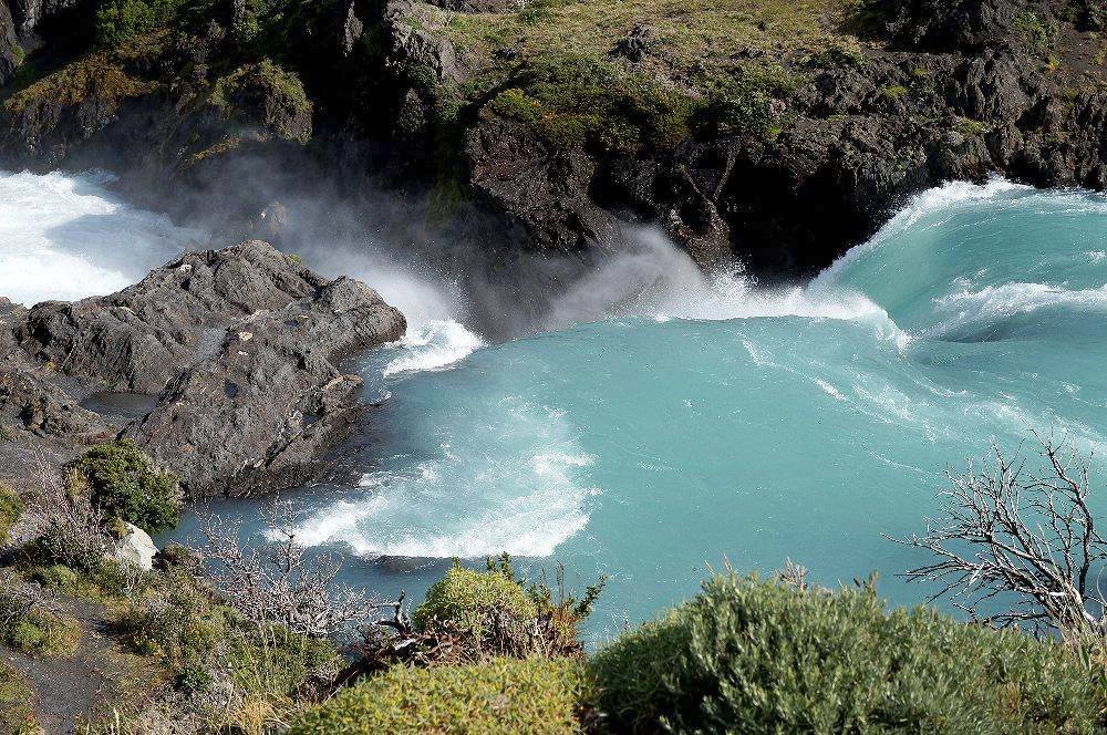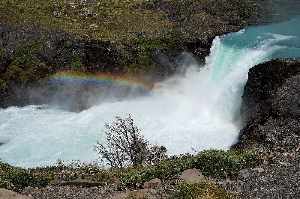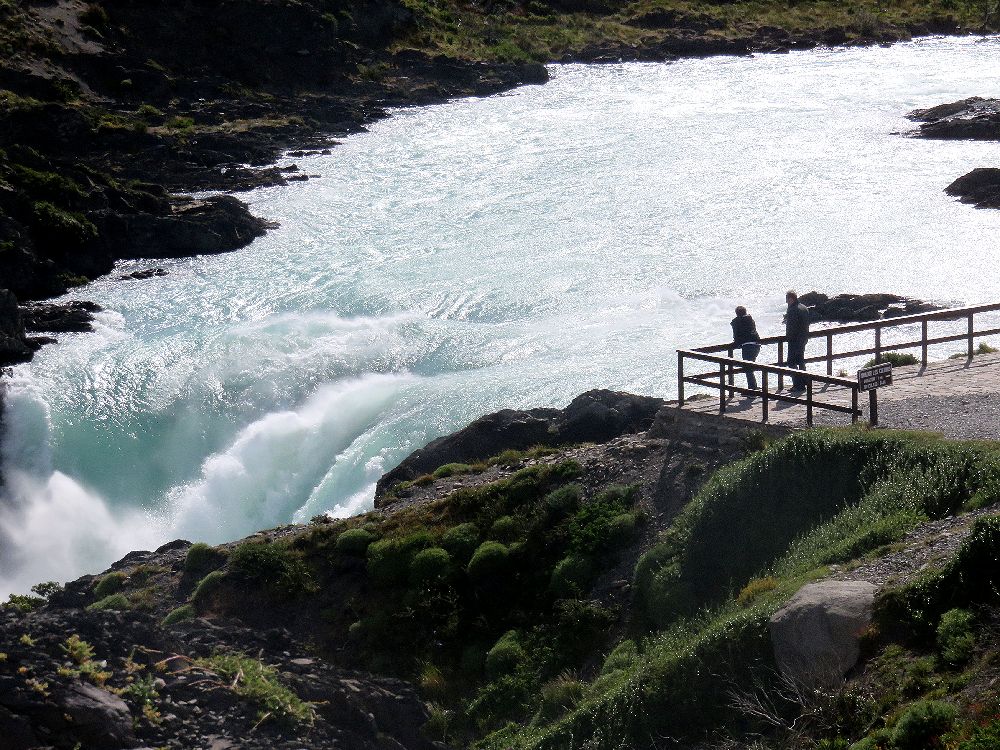 Nordenskjold(ノルデンホールド) 湖から流れ出た川がペオエ湖に流れ込む途中の滝で、けっして落差は大きくないが、水の色の美しさと流れ落ちる迫力のすごさでパイネ国立公園の観光の目玉になっている。行き方は本道からプデート方面の支線に入り、プデートから少し登ったところに広い駐車場が設けられている。常に数台のバスが止まっているほど、ツアーでは必ず立ち寄る人気スポットだ。そこから少し緩い坂道を歩いて行くと、展望台に着く。滝の周りはよく整備され、近くまで下りていける階段もある。ここはパイネの中でも非常に風が強いところだが、2011年の火事で木が全部燃えてしまい、強風を遮るものがなくなってしまった。2014年に訪れた時は、容赦なく向かい風が吹き付け、容易に近づけなかった。滝の周囲も、以前茂っていた木々がすっかり焼け落ち、一面黒い焼け跡を残していた。滝から始まるトレッキングコースは初心者向けの平坦な道で絶景が堪能できる。