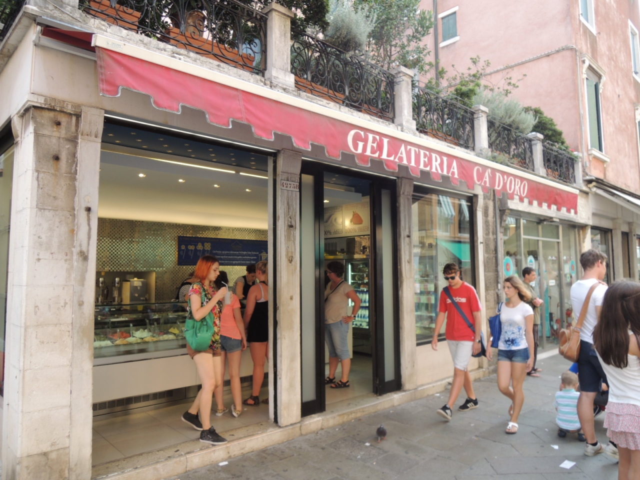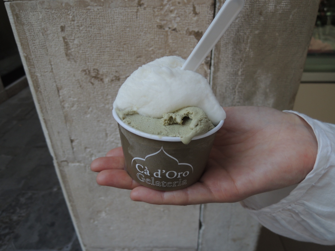 ヴァポレットのカ・ドーロ駅に近く、ヌォーヴァ通り沿いのグロムの近くにあるこのお店ですが、グロムと同様の人気店です。グロムですっかり気に入ってしまったリモーネと初挑戦のピスタチオをテイクアウトで注文。リモーネはグロム同様に美味しく、ピスタチオも美味しかったです。