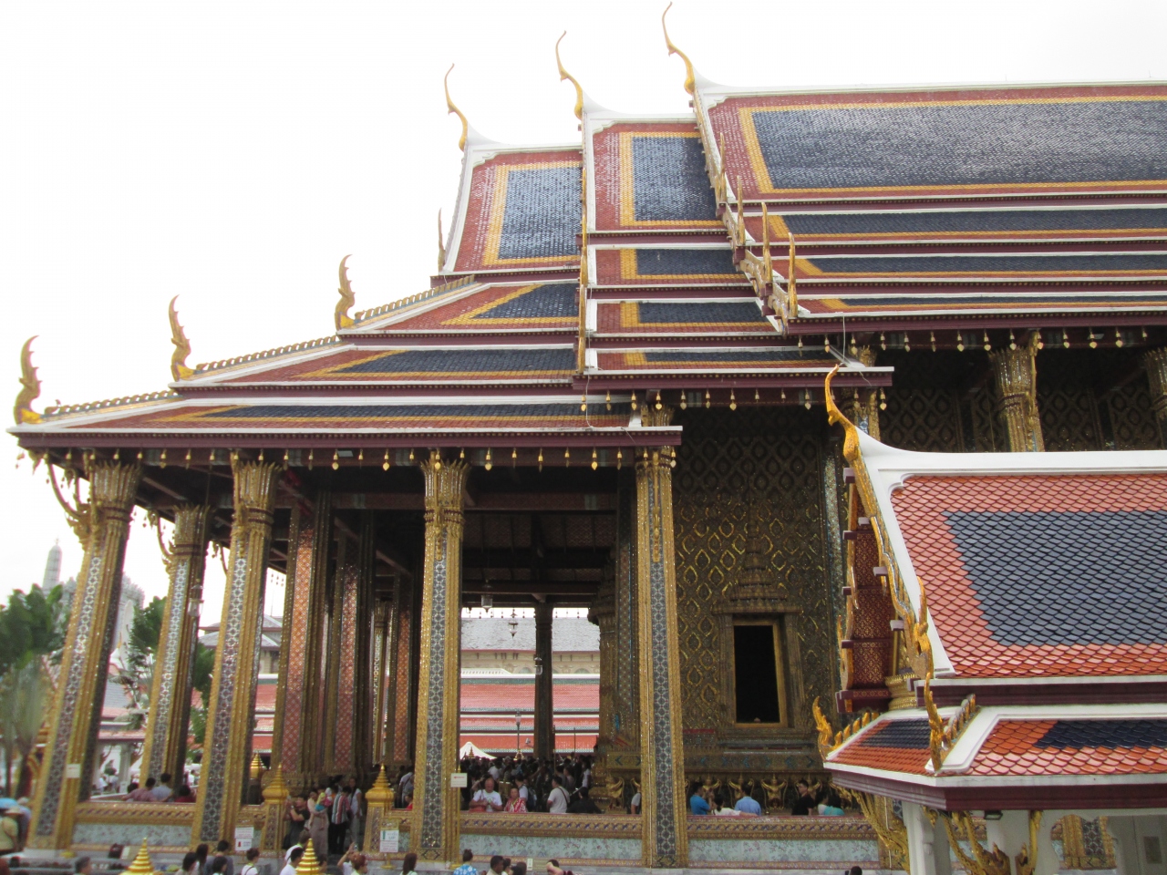 ワットプラケオの入口を入り最初に目にする建物です。入って左側がホー・ラートコーンマヌソーン堂、右側がホー・ラートポンサヌソーン堂です。ワットプラケオ本堂のそばにあり小さい建物ですが金色の柱と屋根の形が特徴的です。