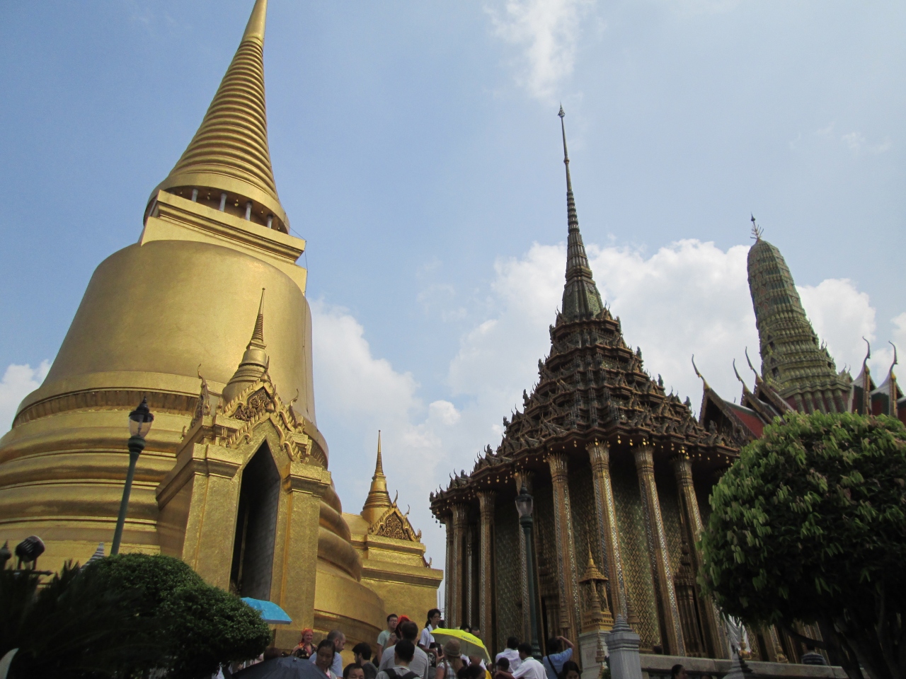 ワットプラケオのほぼ真ん中に建っている経堂です。このなかには仏教の聖典「三蔵経」が収められています。柱と壁面には美しい模様が描かれています。ワットプラケオ内にはいろいろな建造物があり、訪問客で混雑しているので見逃しがちですがポイントの建物です。
