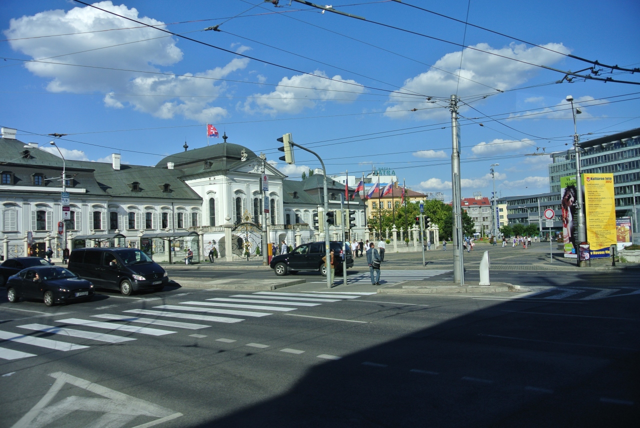 ブラチスラバの新市街にあります。新市街といっても、19世紀以降のけっこう古い建物がありますが、ヨーロッパの人の感覚では新市街となるんですね。白い美しい建物でした。一応門、塀はありますが、それほど大げさな警備はないようでした。