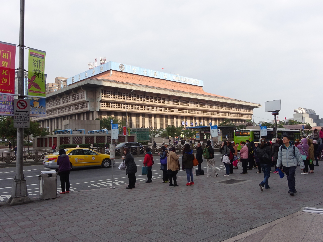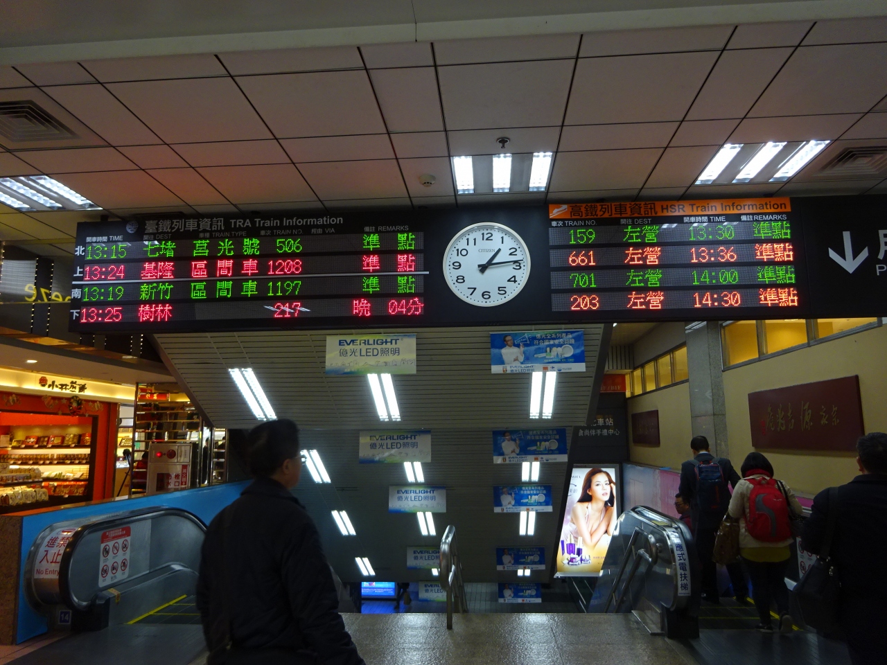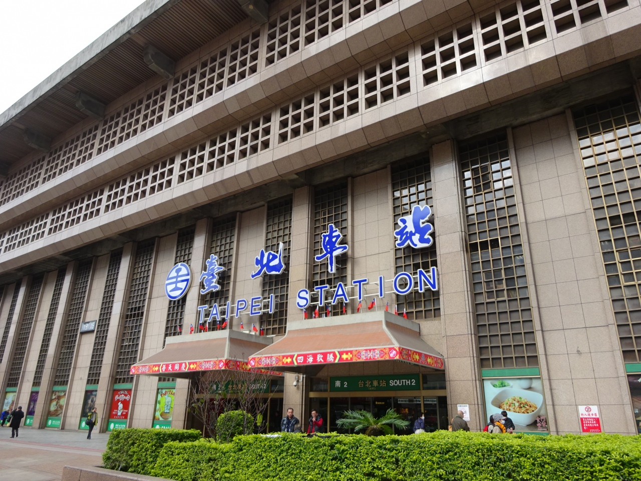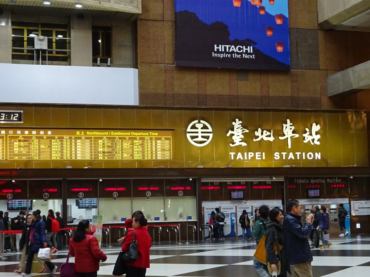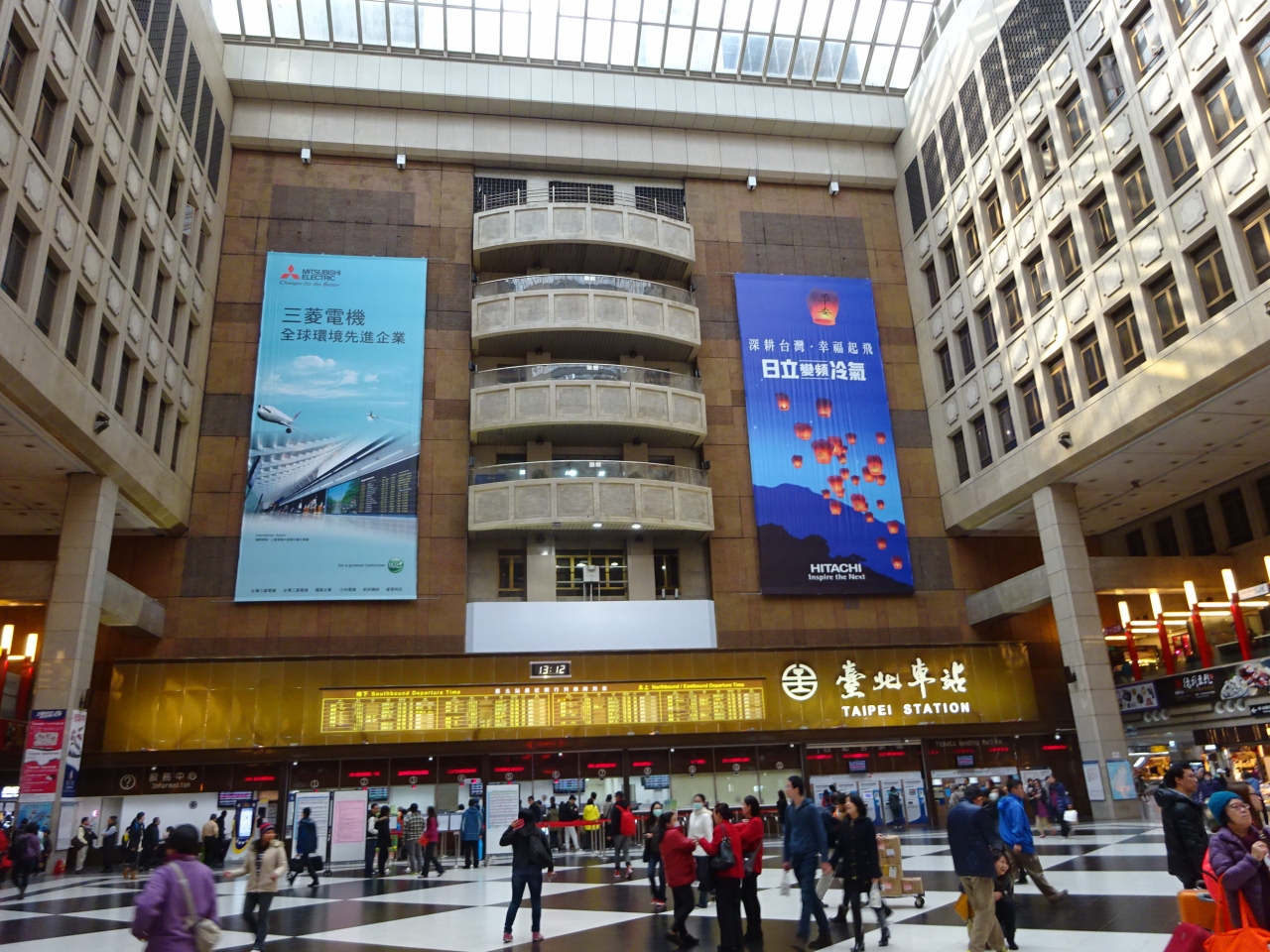 台湾で一番大きなターミナル駅です。台北駅には、台鉄台北駅(台湾鉄道、国鉄地方ローカル線みたいなもの)、高鉄台北駅(台湾高速鉄道、台湾の新幹線)、捷運台北駅(MRT、地下鉄であり近郊電車)の3路線の駅です。台鉄と高鉄の乗り場はほぼ同じ。大きな駅舎の地下1階部分にあります。MRTは少し場所が離れており、駅舎から入ると探しにくいです。駅舎から出て地上にある階段から地下街を通って行くとわかりやすいです。駅舎内は高い天井となっており、大きなクリスマスツリーも小さく感じられました。建物の材質も高級感あふれてました。