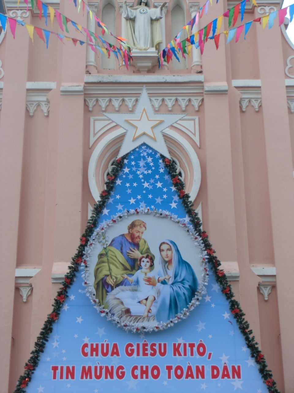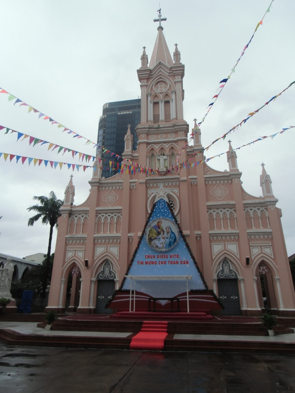 ダナンの町の中心地にある大きな教会です。クリスマスの時期だったので、建物の正面に大きな看板、建物の後ろ側にはサンタクロースやイエスキリストの誕生シーンを思われる飾り物が作られていました。土曜日は建物が閉まっていて中が見られなかったので、日曜煮の午前中のミサの時間に行ったら、大勢の人で建物の外まで溢れていて結局建物の中は見られませんでした。