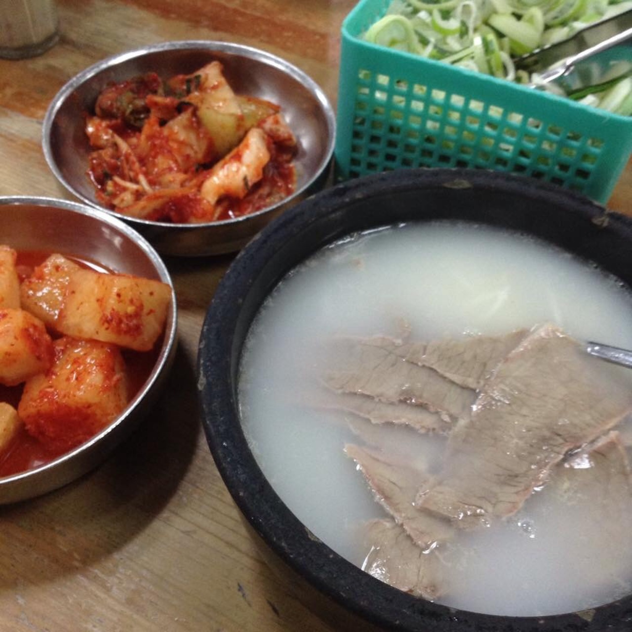 白飯と細うどんが既に投入された状態で運ばれてくる牛出汁のソルロンタンスープには味が付いていないので、卓上の塩、胡椒、ネギ、キムチ、カクテキを使って自分好みの味に整えてからいただきます。