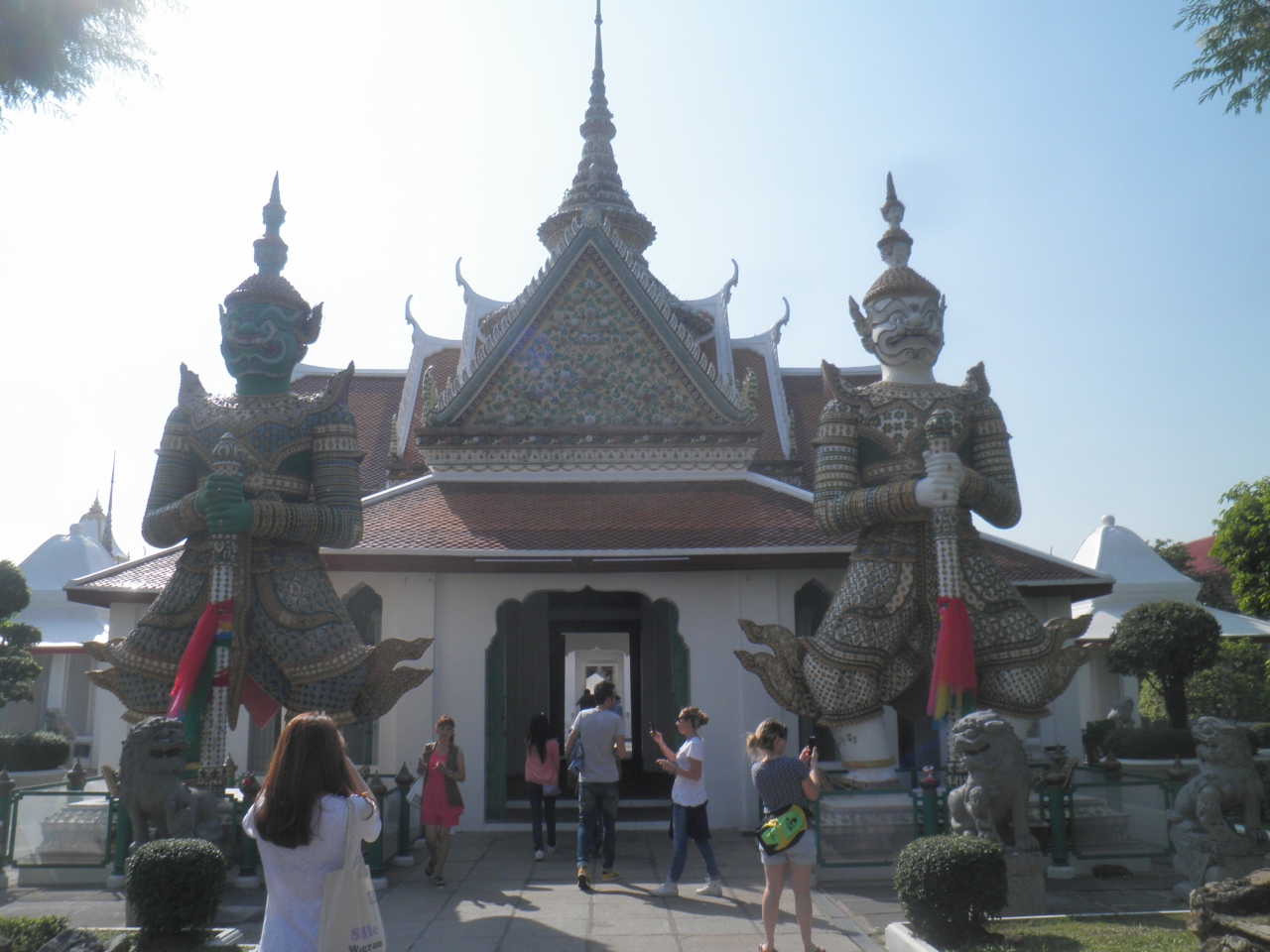 バンコクのワットポーに参拝したあと、渡し船に乗って対岸のワットアルンへ行きました。 船をおりると、本堂の入り口の両側に大きなヤクシャ像が2体立っています。 向かって右側が白っぽい像で、左側が緑っぽい像です。 日本の寺院の門によくある仁王像に比べてユーモラスな感じがしました。