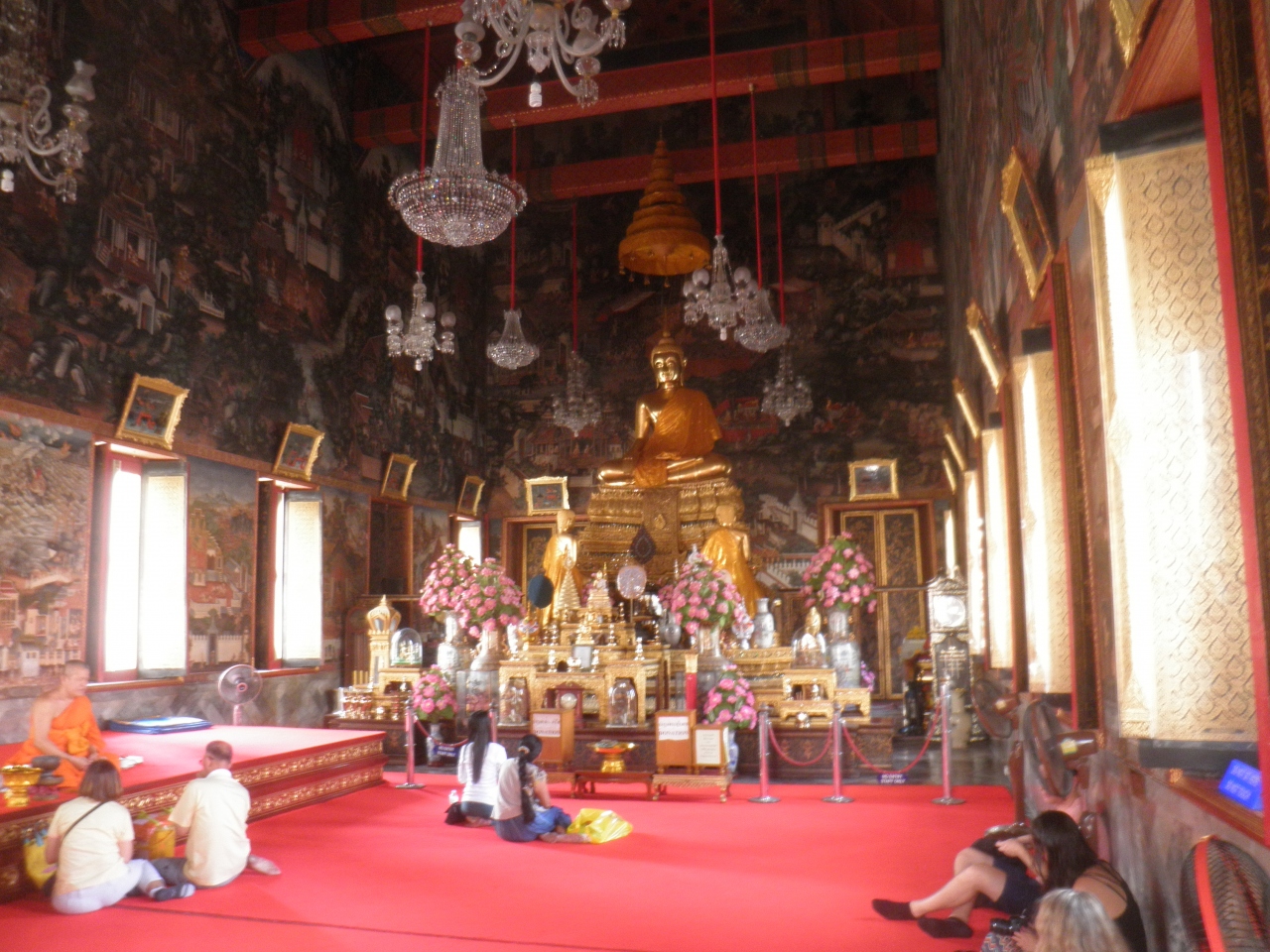 バンコクのワットポーから渡し船にのって対岸のワットアルンに参拝に行きました。 船着き場につくと、ワットアルンの本堂や礼拝堂などの前に出ます。 礼拝堂は靴を脱いで、帽子をとって入りました。 仏像が並んでいて、お坊様に教えを受ける地元の方の姿がありました。 強い日差しと蒸し暑さで疲れたので、しばしここで休憩しました。