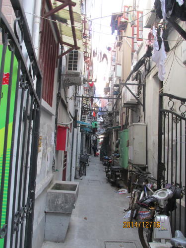 初期の仏国租界にある盛澤路は延安東路と人民路を南北に結ぶ短い道で途中で金陵東路(騎楼が続く)を横切ります。昔ながらの石庫門住宅(西洋長屋住宅)が残っており、多くの住民が昔ながらの生活をしています。盛澤路の両側は長屋住宅の商店街、住宅地への入り口が幾つもあります。中は上に洗濯物、通路にバイク、室内にトイレ、浴室、台所は有りません。通路に石の流しが並んでいるのが台所です。1部屋に一世帯、寝る場所だけ、後は全て外です。