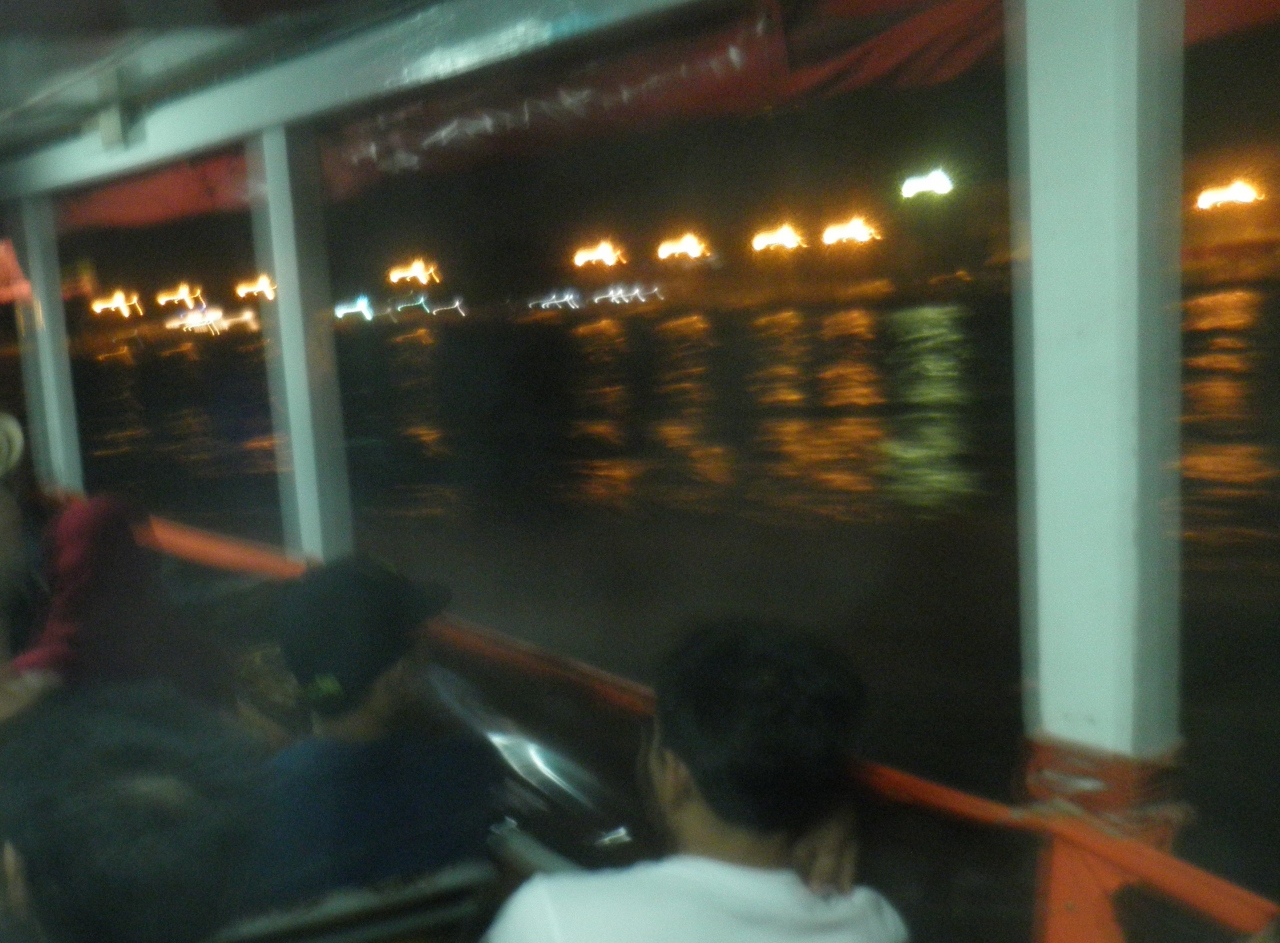 バンコクでチャオプラヤーエクスプレスボートにのって、ワットプラケオにいったとき、ターチャン船着き場に立ち寄りました。 対岸に行く渡し船もここから発着します。 帰りは日が暮れたせいか、土産屋や飲食を売る出店が並びにぎやかだったのがウソのように静かでした。また、対岸に明かりがともりきれいでした。