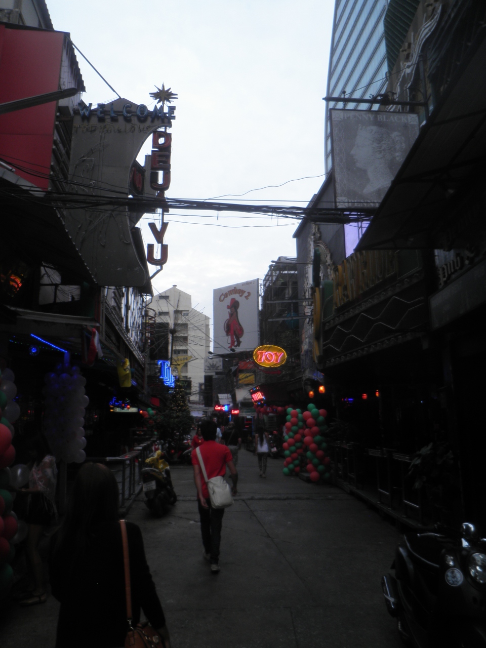 スクムビット駅のそばには大きな飲み屋街があり、夜になるとたいへんにぎわいます。 夕方から開店している店は多いけど、ポップなダンスの店は8時過ぎからのようです。それまで、オープンバーでビールを飲みながら待っているファランをよくみかけます。スクムビット側の券売機がこんでいるときは、少しあるいて反対側の北側にまわるとすいていることが多いようです。