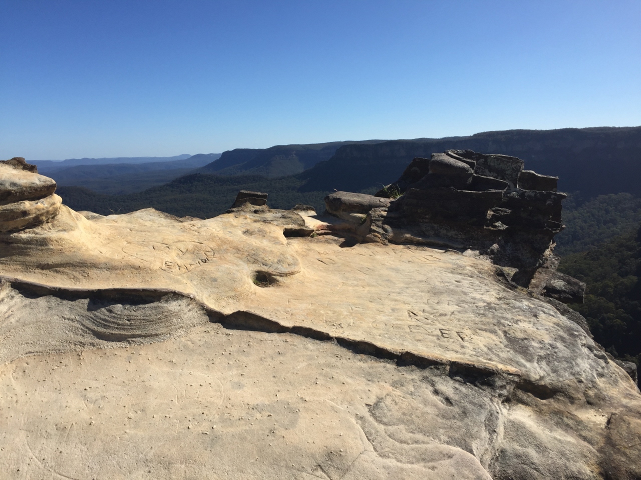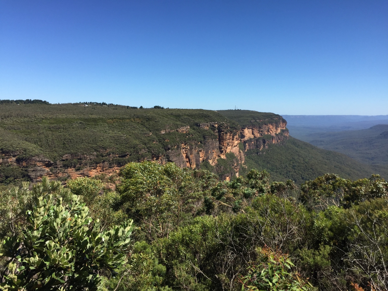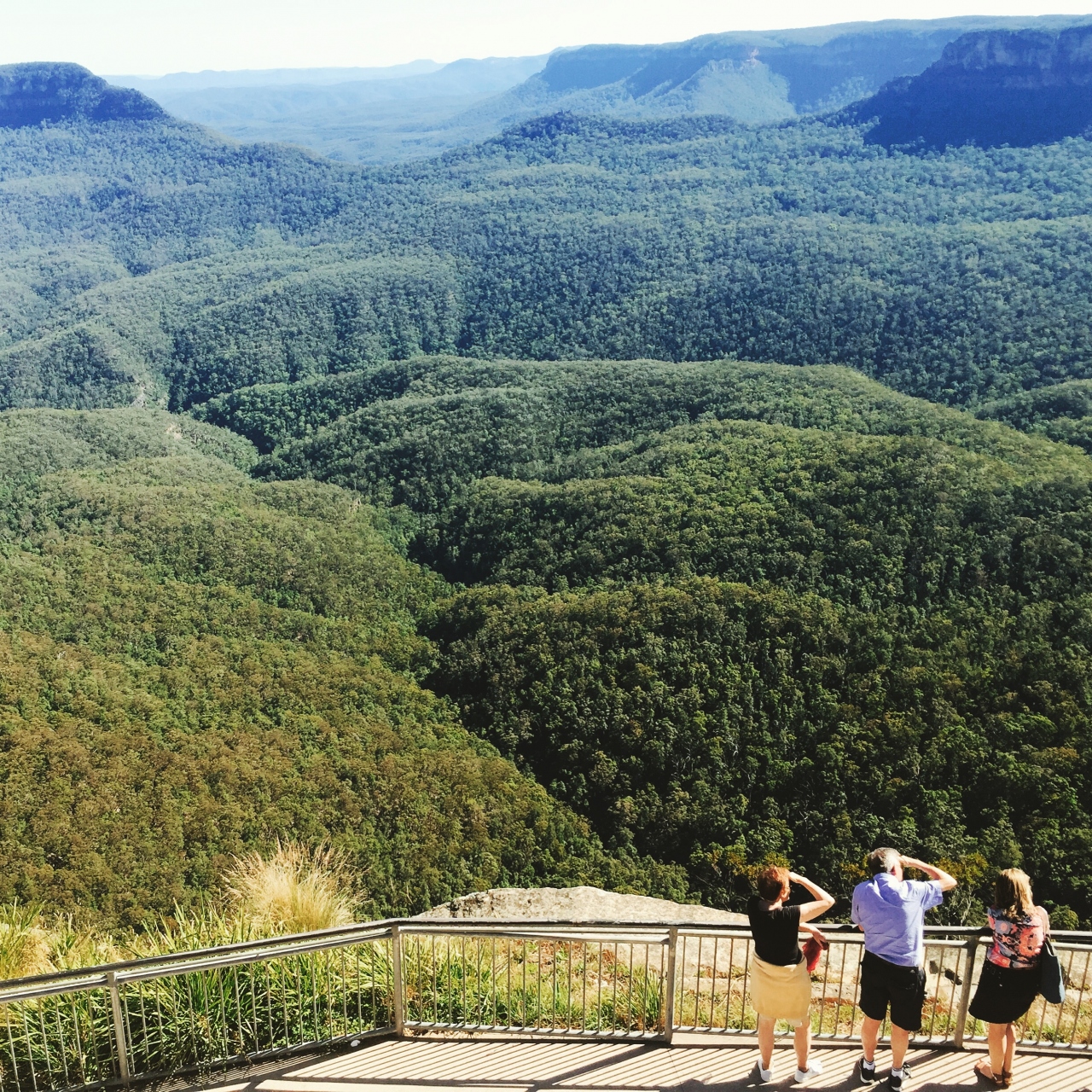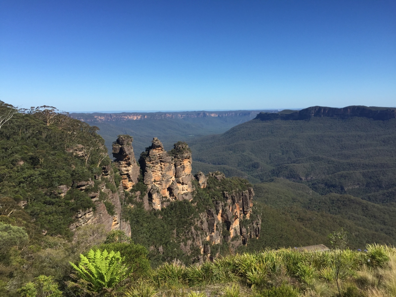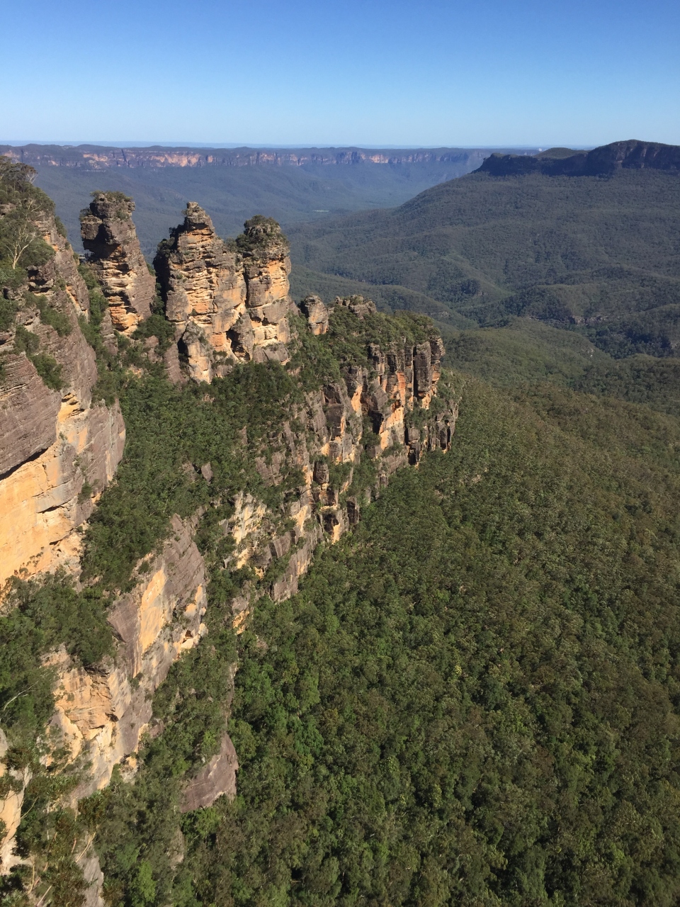 切り立った断崖絶壁と深く濃い大森林に覆われていて展望台からみても果てしないように思えました。公園内には、アボリジニの伝説で3姉妹が岩になったと伝えられる奇岩スリー・シスターズが有名で私たちもこの岩を見たくいていきました!!