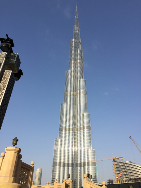 ドバイ・モールから外に出たところでブルジュ・ハリーファを観光しました。世界一の高層ビルだけあって高く圧巻でした。でも細長くて写真におさめるのが一苦労でした。写真の場所まで駅から10分ほどかかるので見る頃にはかなり疲れてしまいます。できたらドバイ・モール駅からバスが出ているのでそちらを利用されることをオススメします。さすがに帰りはバスに乗りました。