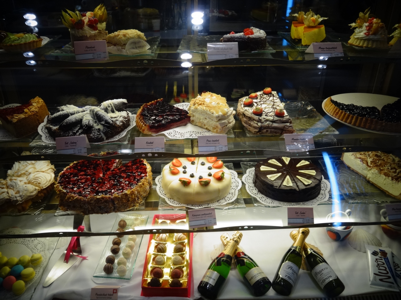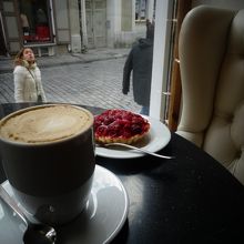 寒さと空腹でお店に入ったら、ここはカフェ。スイーツのみです。ショーウインドーにはケーキがずらり。ベリー系のタルトケーキにしました。おいしい。見た目で想像していたよりあっさり。そしてここはトイレが独房のような洞窟のような広くて暗くて、井戸もあって不思議でした。