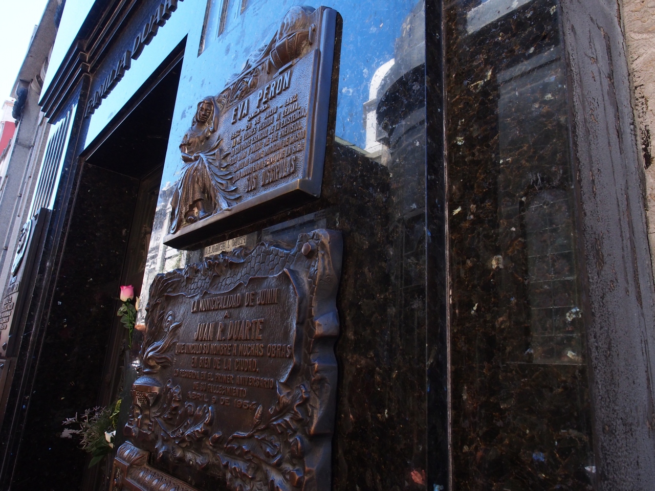 映画やお芝居にもなって日本でも有名なエヴァ・ペロン(エビータ)のお墓です。レコレータ墓地内にありますが、以外にも広めのメインストリートではなくてそこから一歩脇に入った細い横道っぽい通りに面したところにあります。このお墓だけ人が集まっていたりお花が多く飾られていたりするのですぐにわかりました。