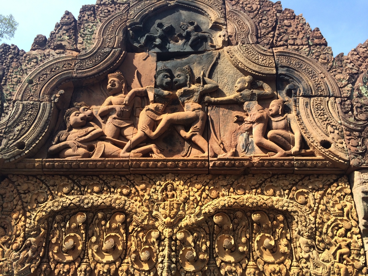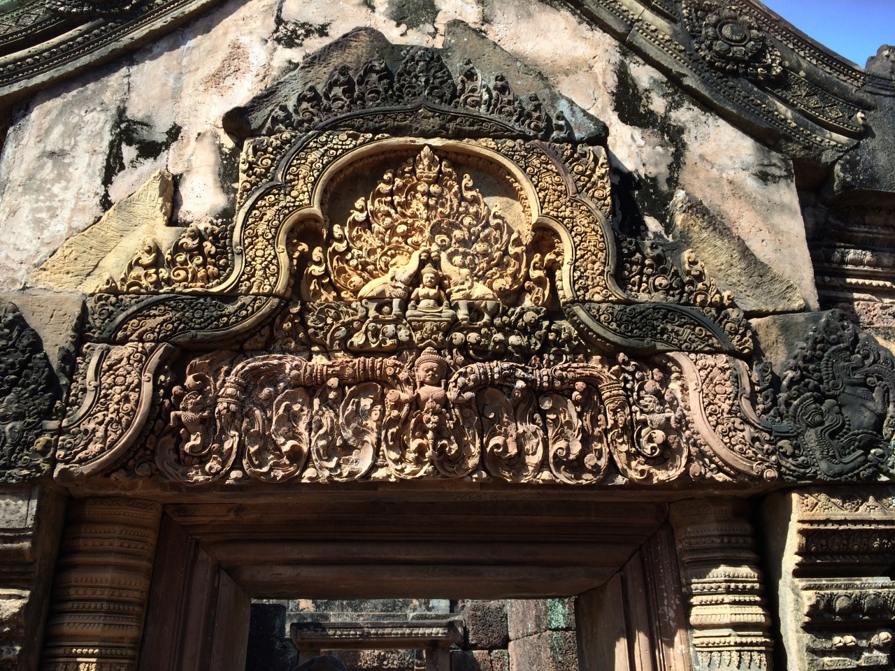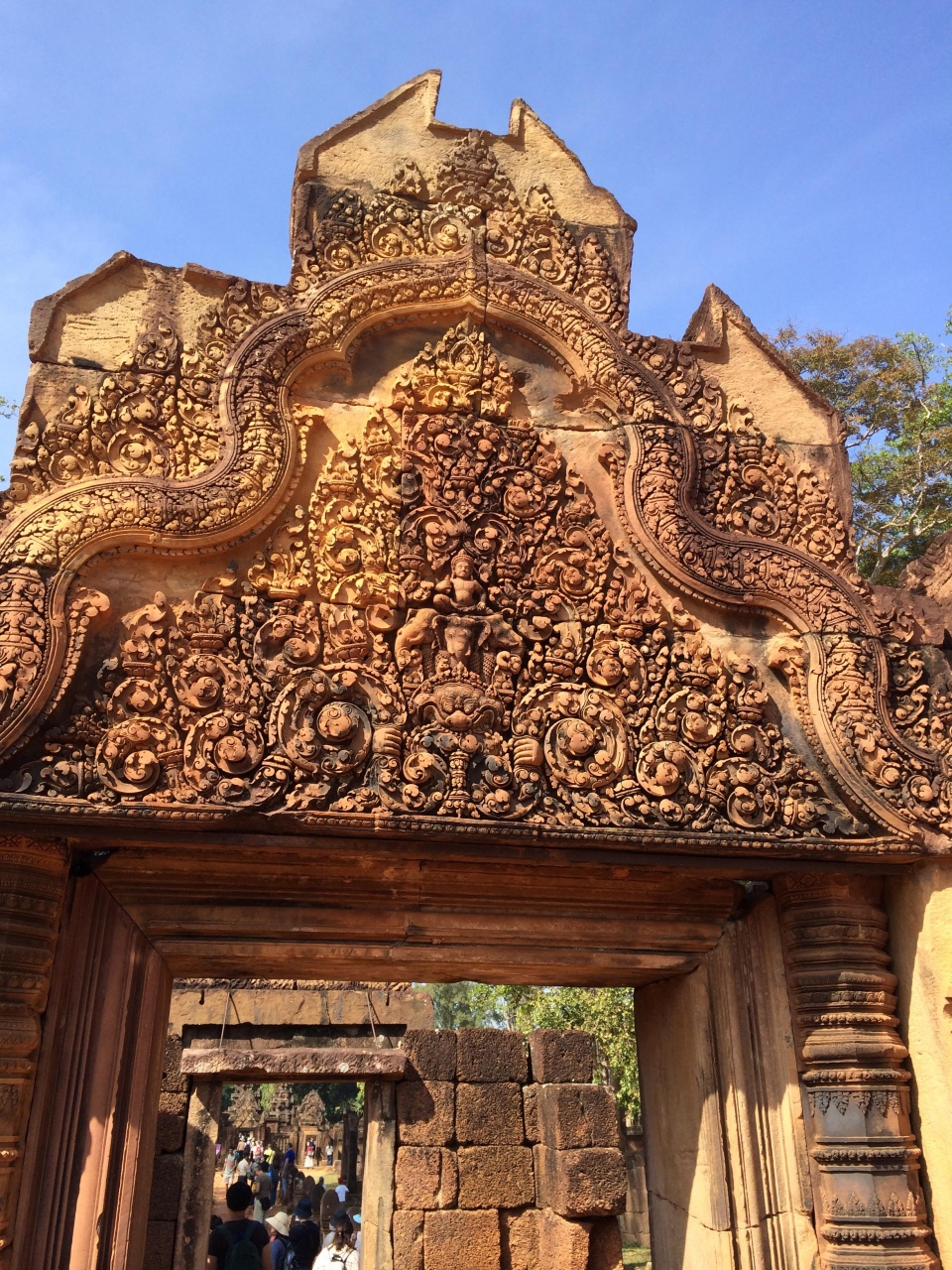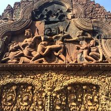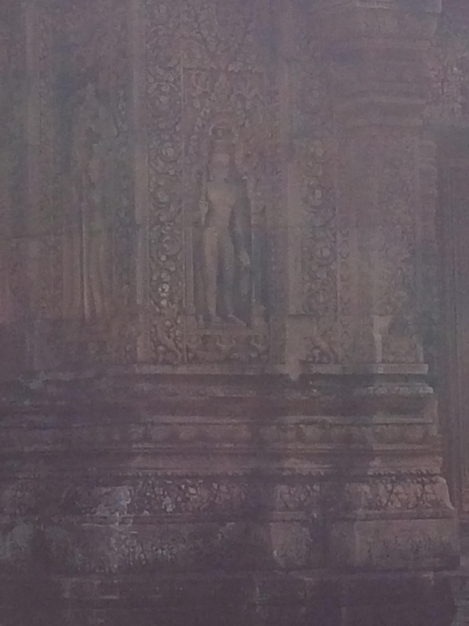 ちょっと足を伸ばしてトゥクトゥクでバンテアイ・スレイまで行ってきました。他の遺跡群とは違い、駐車場や土産物屋など整備されて観光地らしくなっていました。赤く美しい寺院内には、綺麗なレリーフがたくさんありますが、一番の見どころはやはり東洋のモナリザと呼ばれるデヴァターでしょう。近くで見ることができないのが残念でしたが、その美しさに見とれてしまいました。