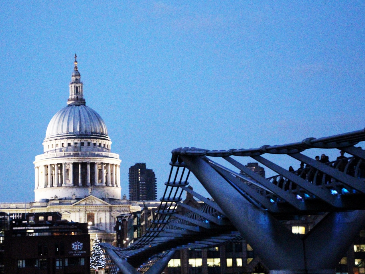 空が晴れ夕焼けが出ているならば、紅の空に浮かび上がる白亜の大聖堂と青くライトアップされたミレニアム橋がコラボした景色を愉しむことが出来る。