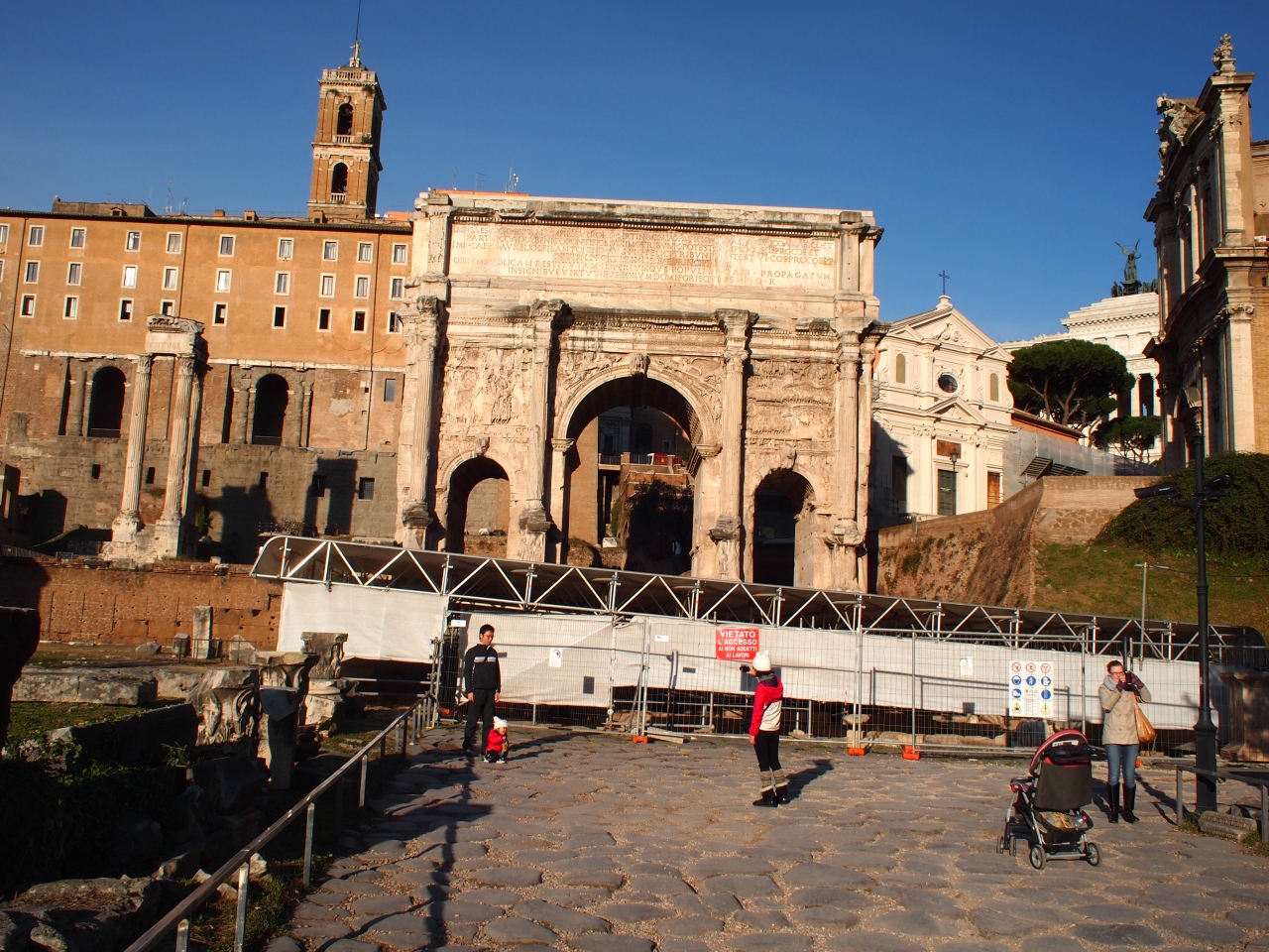 フォロ・ロマーノには2つの目立つ凱旋門がありますが、そのうち3つのアーチを持つ方が、セヴェルスの凱旋門です。ティトゥスの凱旋門より100年少し新しい建築物で、装飾も美しいというのですが、私達が訪れたときは近づくことが出来ず、残念でした。