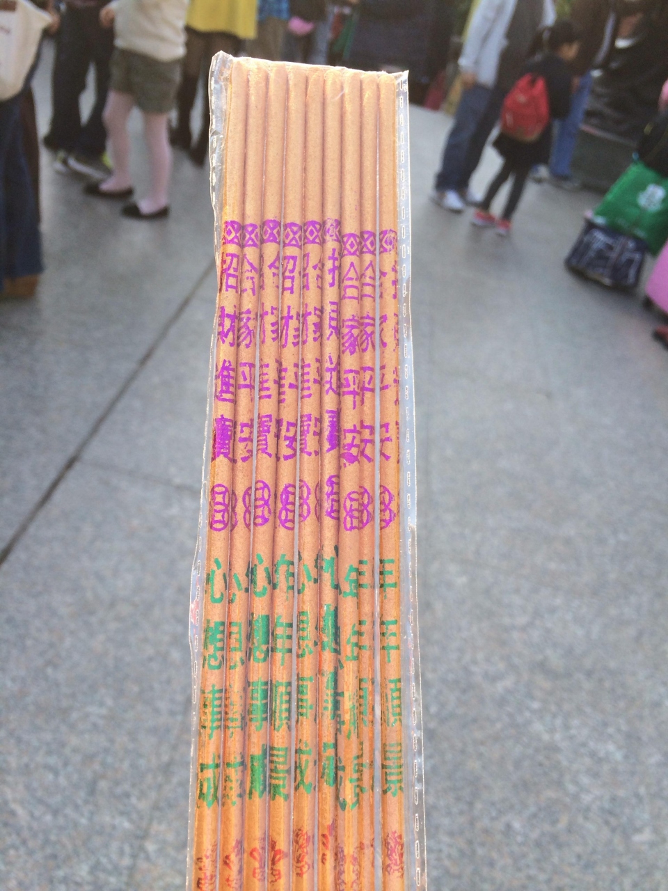 ツアーなら、必ず行くのではないかという、道教のお寺です。入り口のところに並んでいる売店で線香を買って入ります。今は、危ないので、本殿のところには9本までしか持って入れません。9本セットの線香は10ドルでした。