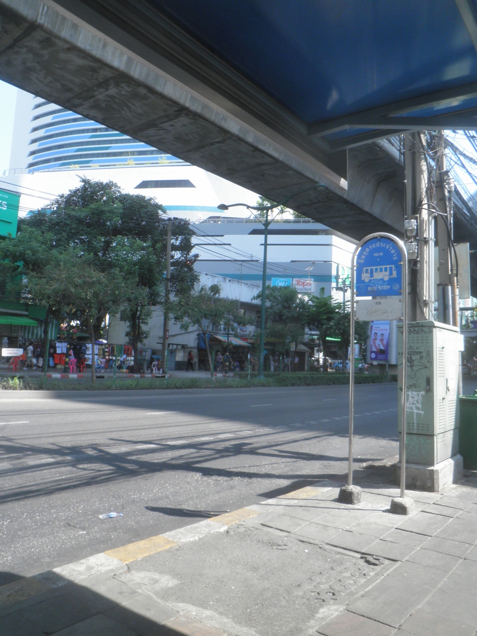 スクムビット通りのアソーク駅の近くのバス停から、安宿街のカオサン通りまでエアコンバスで行きました。 ガイドブックの地図からカオサン通りでとまるバスの番号をメモに写して、バスがくるたびにチェックしました。 20分間ぐらいまって511番バスのエアコンバスが来たのでのりこんだけど、渋滞がひどくて車内は混雑していました。BTSとチャオプラヤーエクスプレスボートで行けばよかったと後悔しました。車掌さんに、カオサン近くの市場のバンランプーと行く先をつげるとわかってくれました。