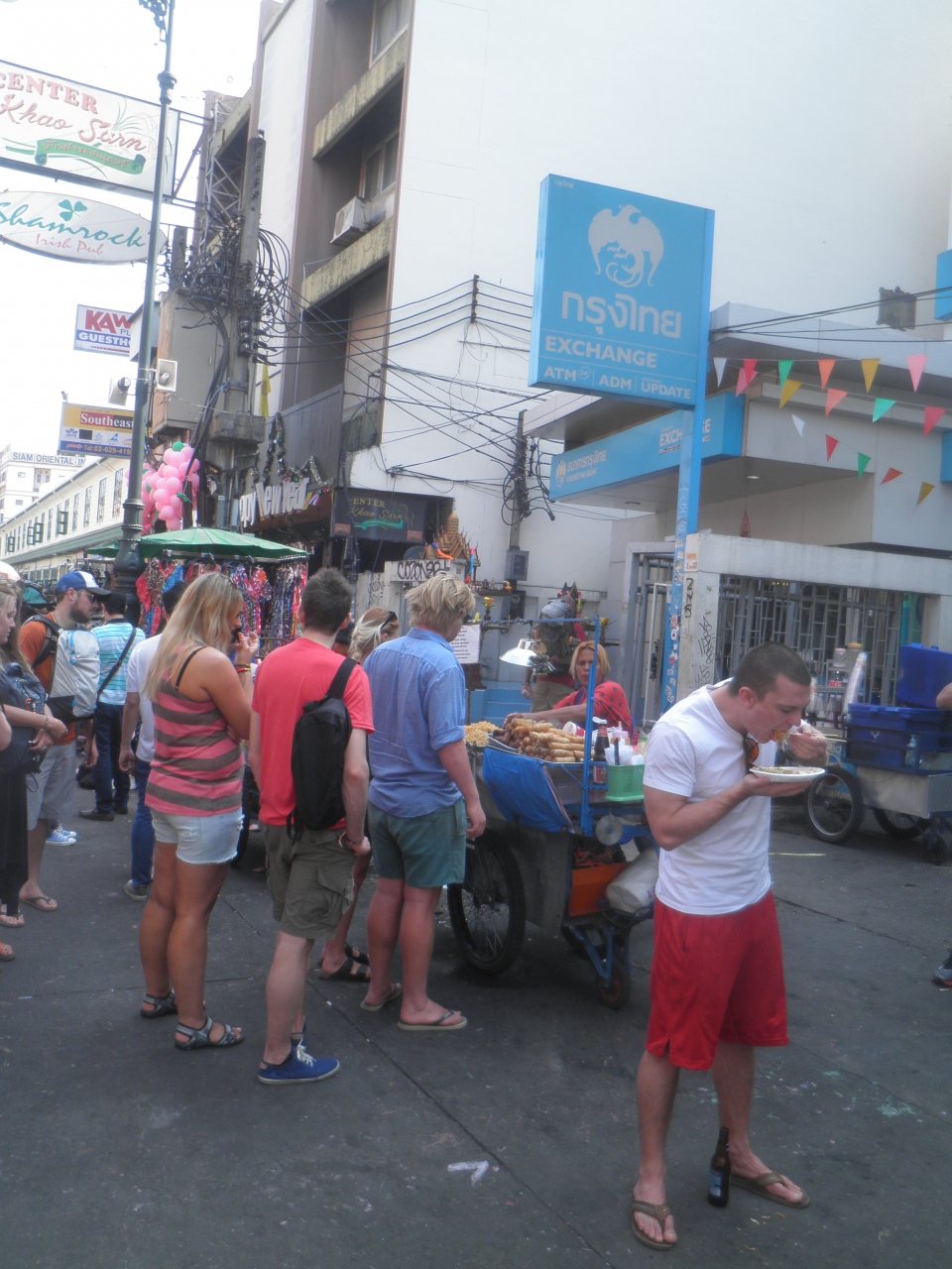 年末年始にバンコクを旅行したとき、カオサン通りに路線バスで行きました。 旅行シーズンなので観光客が多く、特に、夕方の人ごみはすごかったです。 手軽な屋台料理として、パッタイというタイ風焼きそばの屋台が多いです。 具材によって値段がかわり、30バーツぐらいからあるようです。