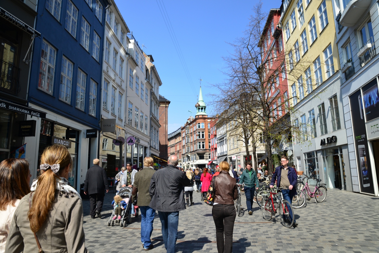 コペンハーゲンの随一の繁華街で、歩行者天国になっています。ブランド店やロイヤルコペンハーゲンの本店、百貨店、レゴのお店などが立ち並んでいて、観光客や地元の人でたいへん賑わっていました。通りをつきぬけたところは市役所前の大きな広場になっていてコンサートのような催しをやっていました。
