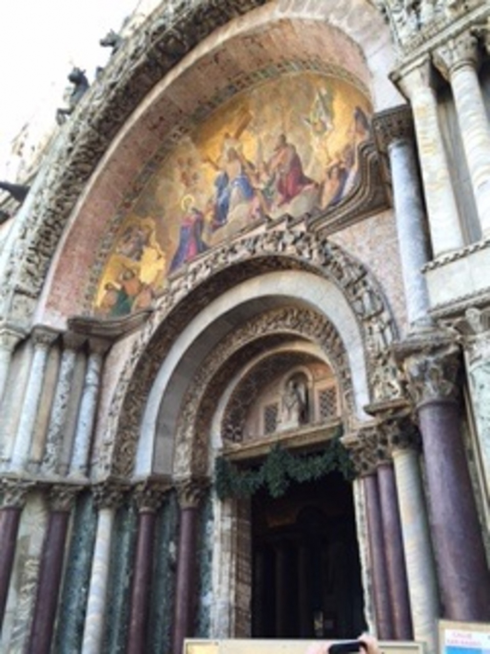 福音記者マルコに捧げるために、1060年代に建てられたようで、以来900年に渡って増築や改修が続けられました。ベネツィアの代表的なビザンチン建築ですが、水の都だけあって、かなりの頻度で水没することがあるようで、入り口近くの階段には、水の跡がくっきりとついていました。
