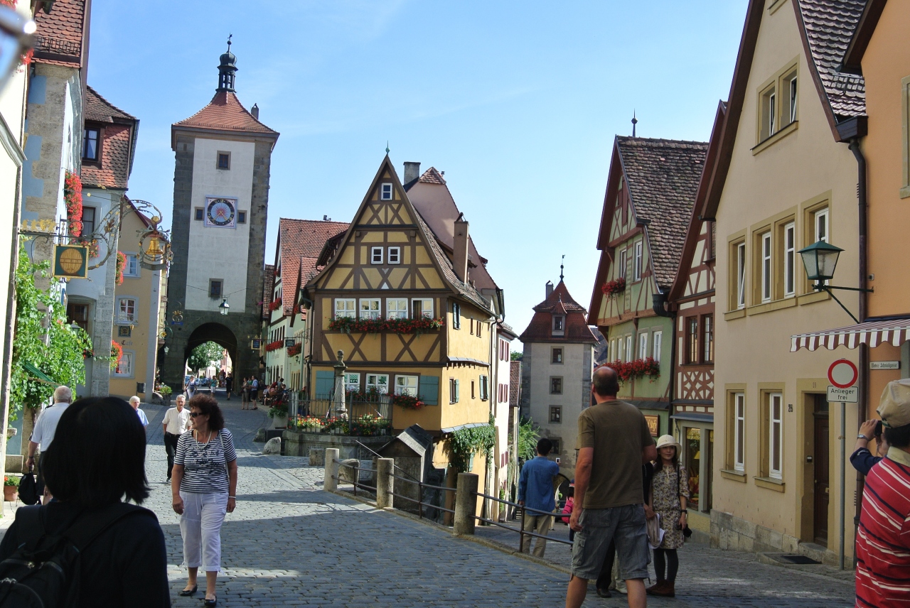 観光パンフレットなどにもよく載っているローテンブルクの一番の写真スポットなので記念撮影をする人でいっぱいです。夜になって行ってみるとさすがに人は少なくなっていました。ライトアップもされていたので、昼間とはまた違った雰囲気でよい写真が撮れました。