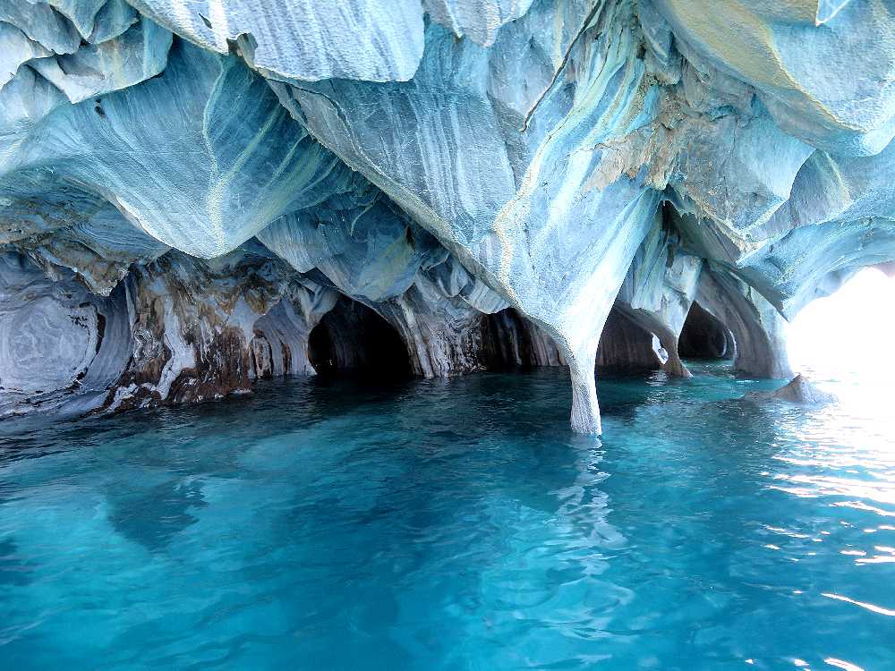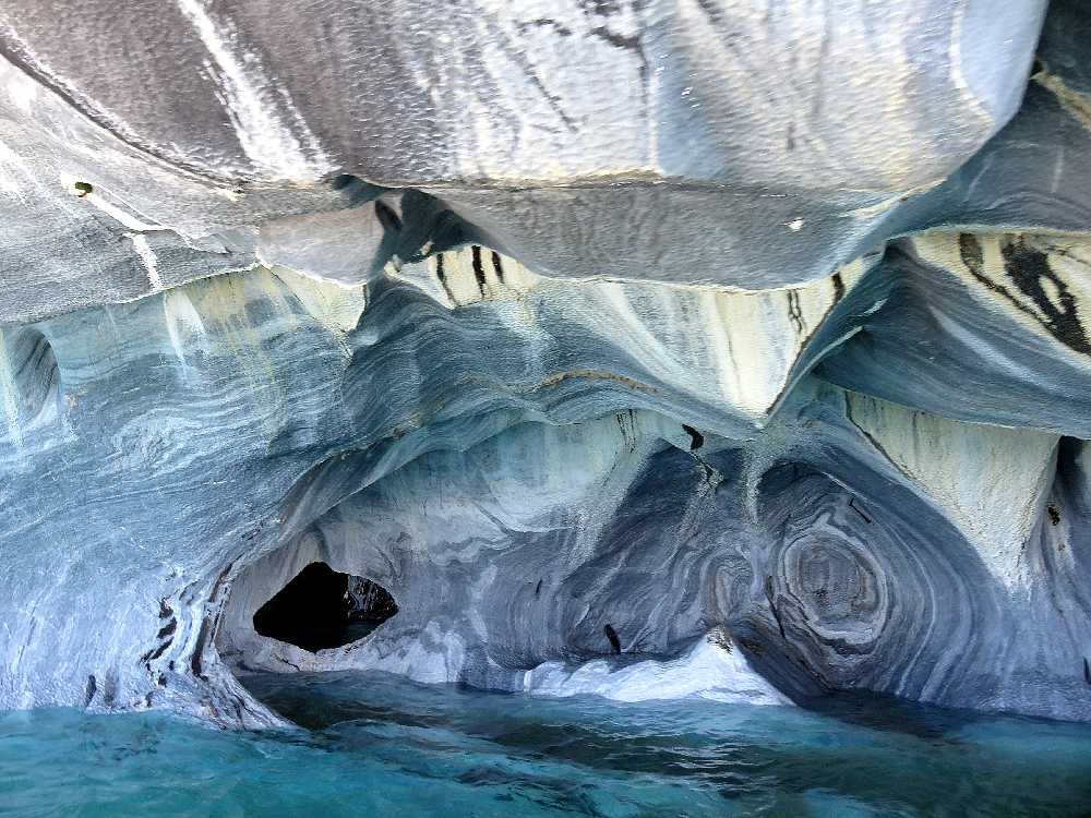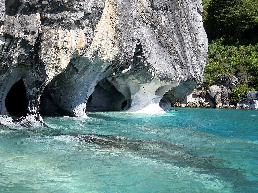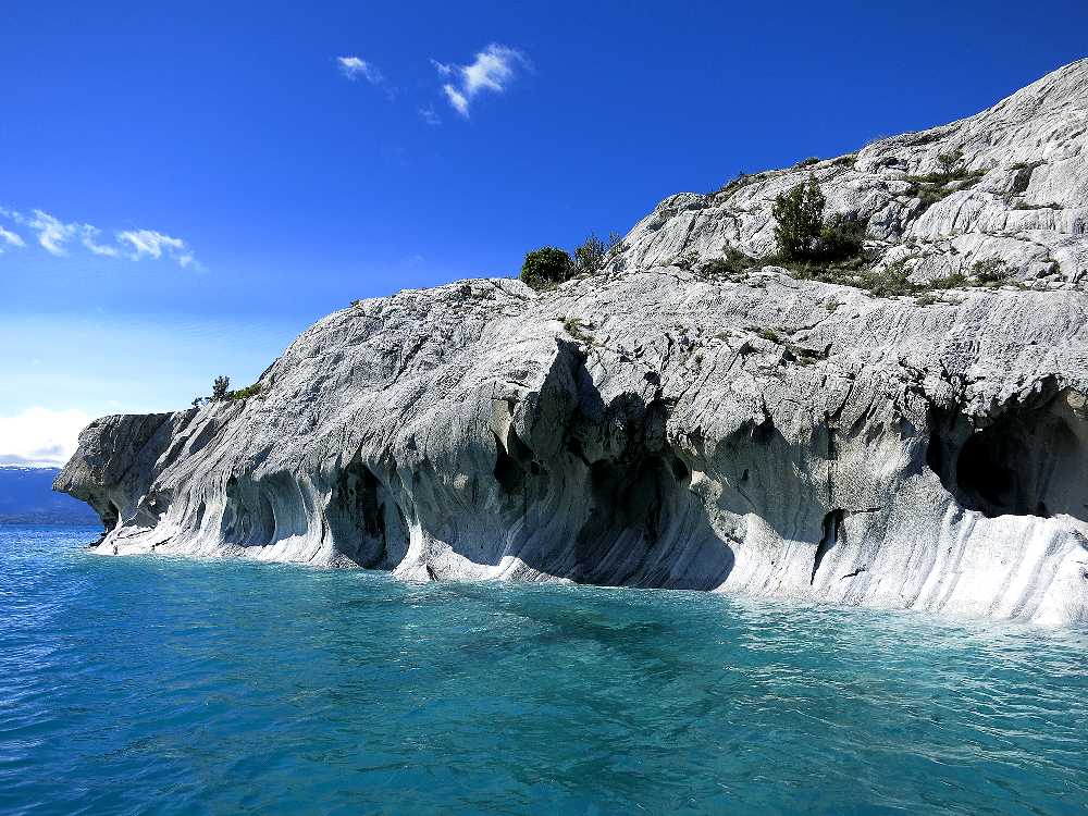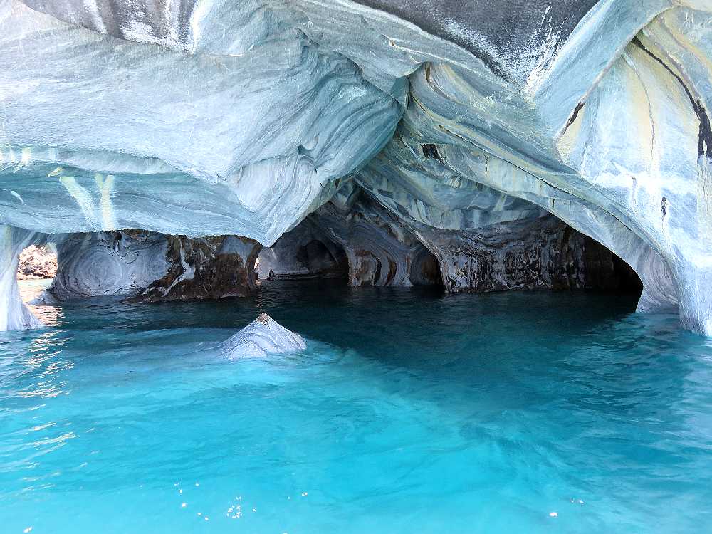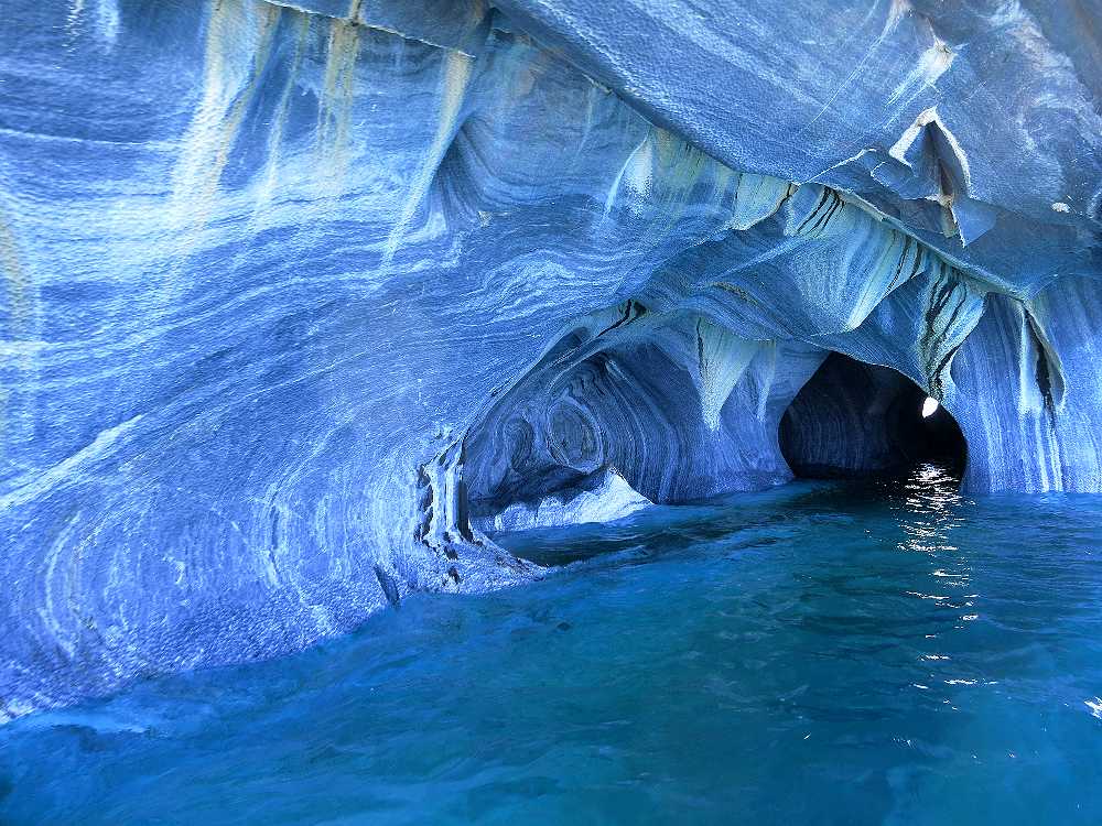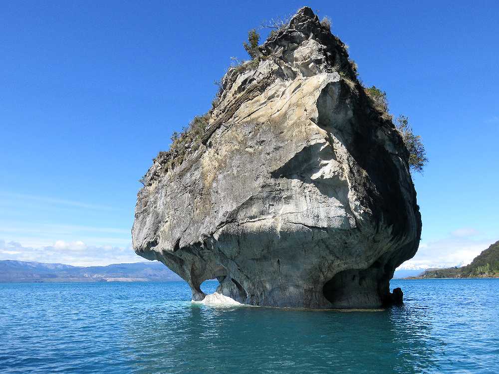 アウストラル街道の観光の目玉として近年人気が出ている観光スポット。チリの(Coyhaique)から車やバスでリオトランキーロまで行き、小さな6.7人乗りボートに乗り換えて15分から20分くらいヘネラル・カレーラ湖を進むと見ることができる。6200年以上もの間,湖の波の浸食により石灰岩の一枚岩の中に洞窟や柱やマーブル模様ができ、カテドラル(寺院)やチャペル(教会)のようにみえるようになったものだ。晴れて、波が穏やかな日には美しいトルコ色の湖の色に映えて魅力的な景観を作り出している。ボートツアーでは最初高い崖下の洞穴群(Marble caves)を訪れ、続いて大きなマーブルカテドラル(Marble cathedral),最後にちいさな軍艦のような形をしたマーブルチャペル(Mable chapel)に連れていってくれる。港には猛スピードで戻るので、波しぶきでカメラを濡らさないように注意が必要だ。高波が怖くて撮影どころか必死でボートにしがみついていた。ツアーの料金は頭割りなので、オフシーズンは高くついてしまう。私たちは2人だけだったので、二人で7000円近くかかってしまった。