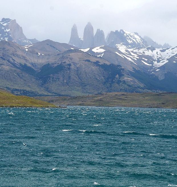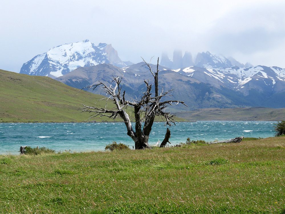 パイネ国立公園の東端にある湖。アマルガ湖方面から来ると、トーレスデルパイネ国立公園管理事務所の手前で右折して、パイネ滝の前を通り、未舗装路を15キロほど車で走ると眼下にこの湖が見えてくる。名前の通り水の色は緑青色で、春は湖の周りがタンポポで埋め尽くされ、真っ黄色に彩られる景観は見ごたえがある。湖岸にはエコキャンプの建物があり、トイレシャワーの設備もあり、昼食を食べる木のテーブルやいすも用意されている。2008年に初めて訪れた時はタンポポとパイネの角と湖の絵のような風景を目にすることができたが、カメラの故障でいい写真が撮れず、2014年に再訪したときは時期が遅く天気がいまいちで残念な結果だった。ここから見るパイネの塔は3本そろっていて、隠れた絶景の地だ。また、アズール湖に向かう道路沿いでは、多くのグアナコに出会うことができるのも、ドライブの楽しみのひとつだ。