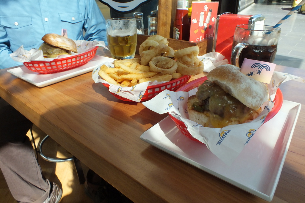 バーガーは肉厚、サイドメニューのオニオンリング&チップスは山盛り。