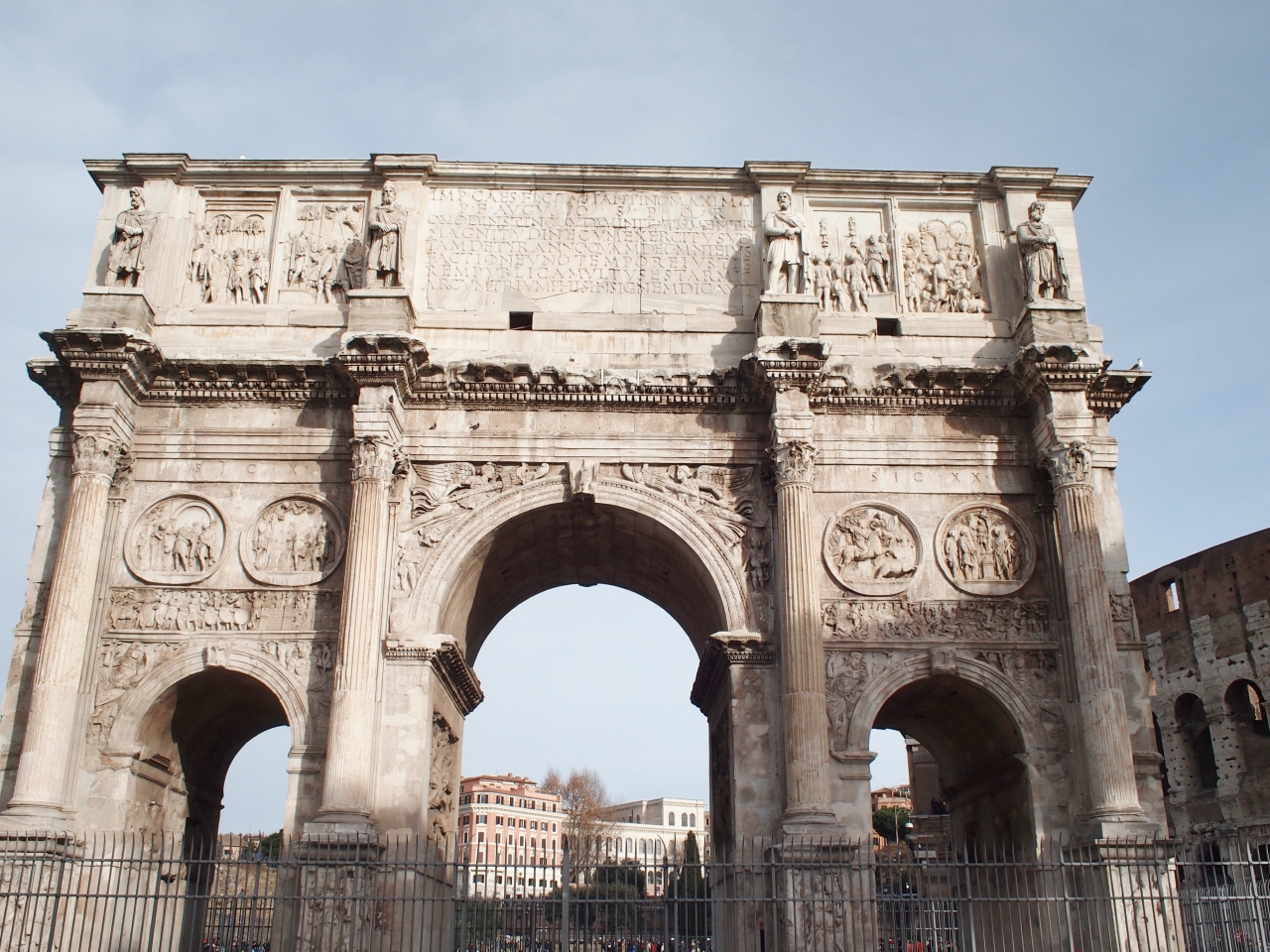 コロッセオの隣にあり、とてもよく目立つ凱旋門です。柵で囲まれているため、中を通り抜けることが出来ないのが残念ですが、美しい姿はよく解ります。即位10年目の戦争勝利を記念して造られたようですが、他の皇帝の時代の石材を転用しているようで、様々な時代の浮き彫りなどがあるようでした。