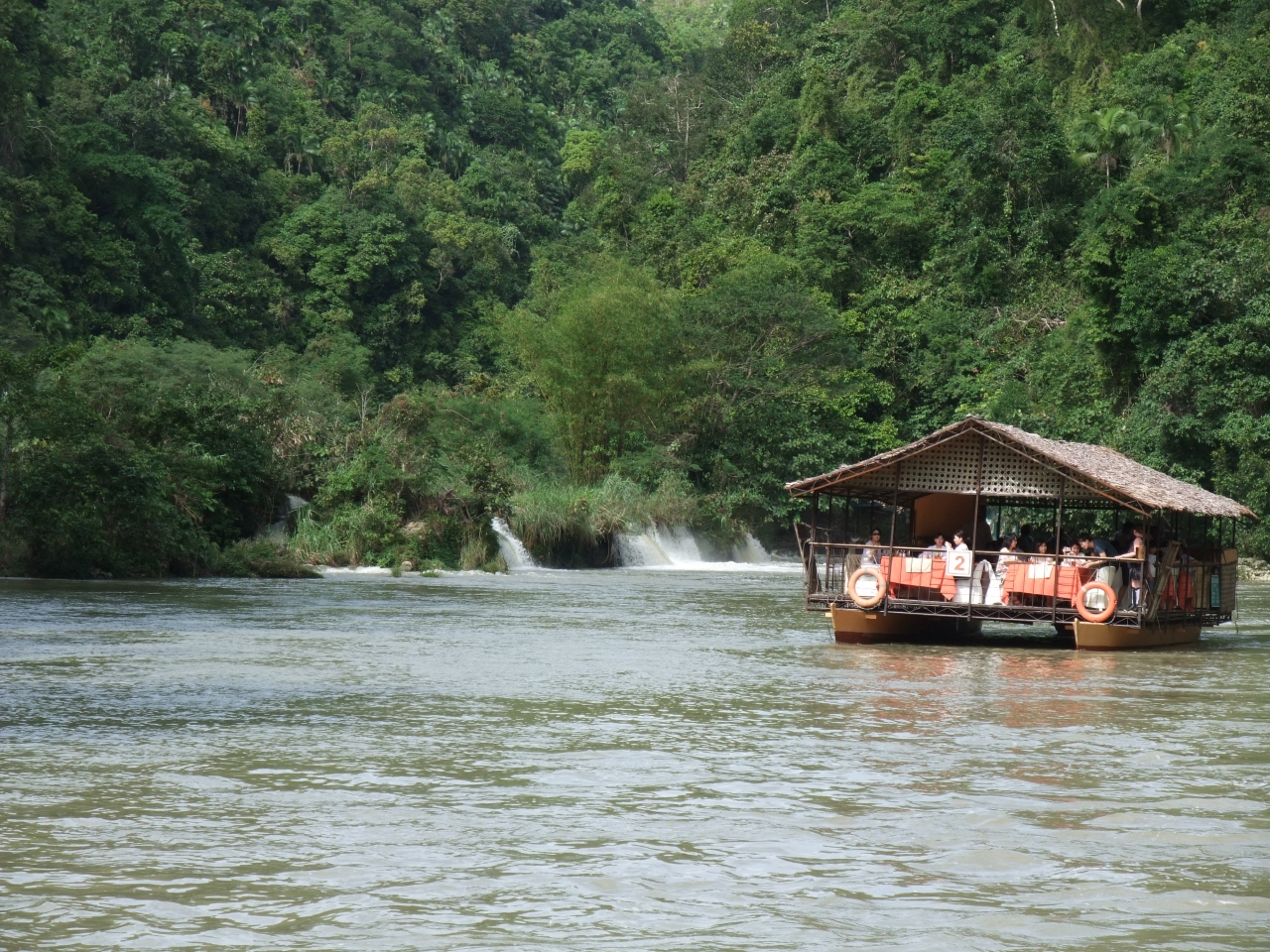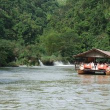 席が埋まり、一通り料理を取り終わり、落ち着いたころにレストランがそのまま移動を開始します。クルーズの始まりです。川はとてもニゴニゴで茶色でしたが、屋根つきのレストランのため風がとてもきもちがいいです。英語の歌をバックミュージックにゆっくり川くだりをします。途中小さな滝をみてひきかえします。