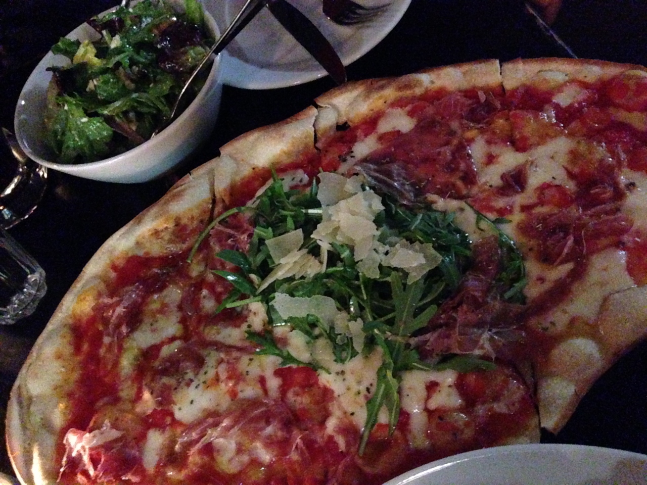 シーザーサラダに生ハムのピザ、ジェノベーゼのペンネをチョイス。
