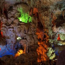 階段を上って入る洞窟はそこそこ広く、大小様々な鍾乳石がライトアップされていてとてもきれいです。