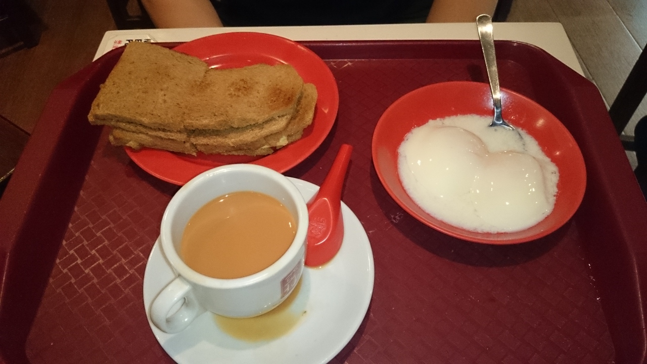 炭火で焼いたトーストに、バターとカヤジャムという、ココナッツとパンダンリーフで作られたジャムがはさまれています。4等分されたトーストと紅茶、たまごのセットがお勧めです。たまごはパンをひたして食べたり、そのまま胡椒やお醤油といただきます。小腹を満たせる量で、4ドルほどなので、朝ごはんやおやつに適していると思います。