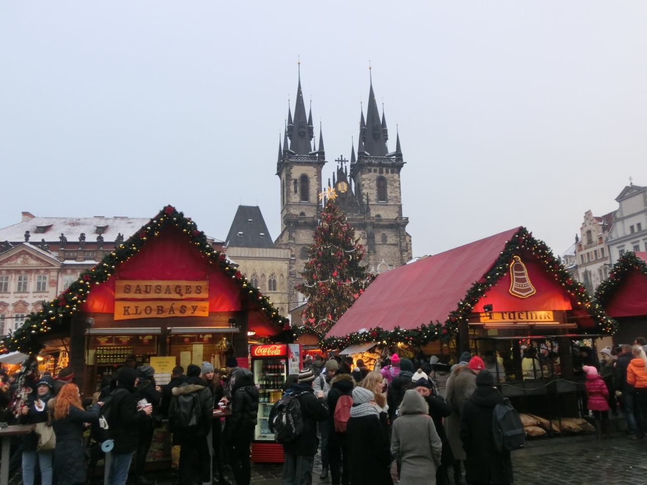 この、ただでさえステキな広場に、12/24の4つ前の日曜日(11月下旬頃)から、1/1までクリスマスマーケットが開かれています!旧市街広場のシンボルともいえる2つの塔を持つティーン教会の前には、大きな大きなクリスマスツリーが飾られ、周りにはグリューワイン、プラハ名物のシナモンパン?のTrdelnik(トゥルデルニーク)、ホットドッグ、クリスマスオーナメント等、様々なブースが並んでいます。