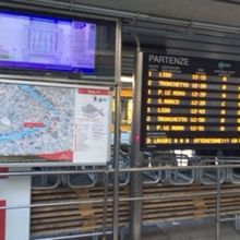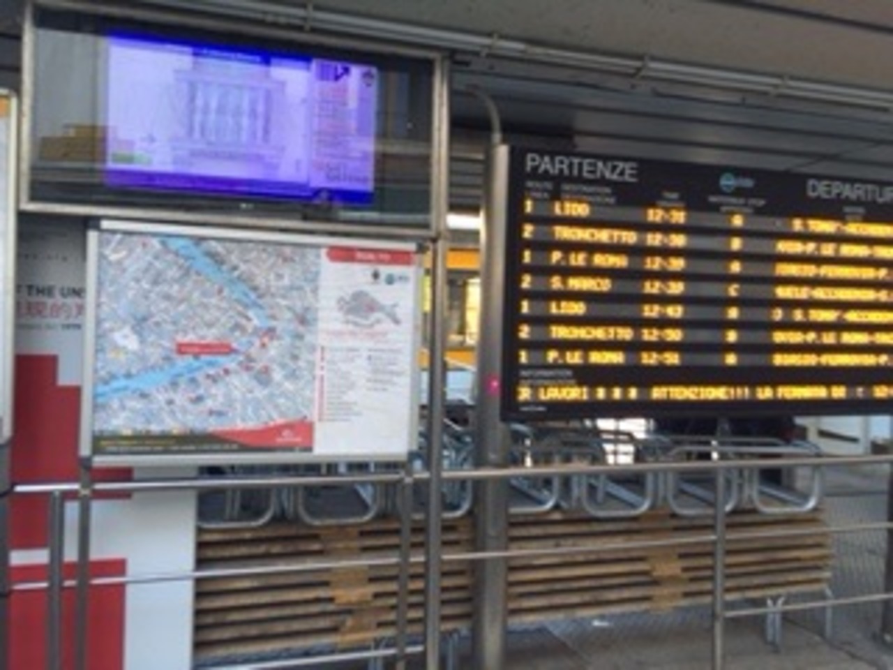 リアルト橋近くのヴァポレット乗り場「リアルト」の掲示板です。行き先ごとの出発時刻と到着時刻の電光掲示板があり、少し驚きました。イタリアでしかも船にそれほど正確さが求められているのかとも感じますが、考えてみれば、バスと同じなのだと納得しました。
