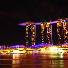 マリーナベイサンズのライトショーを真向かいのレストランで見ていました。